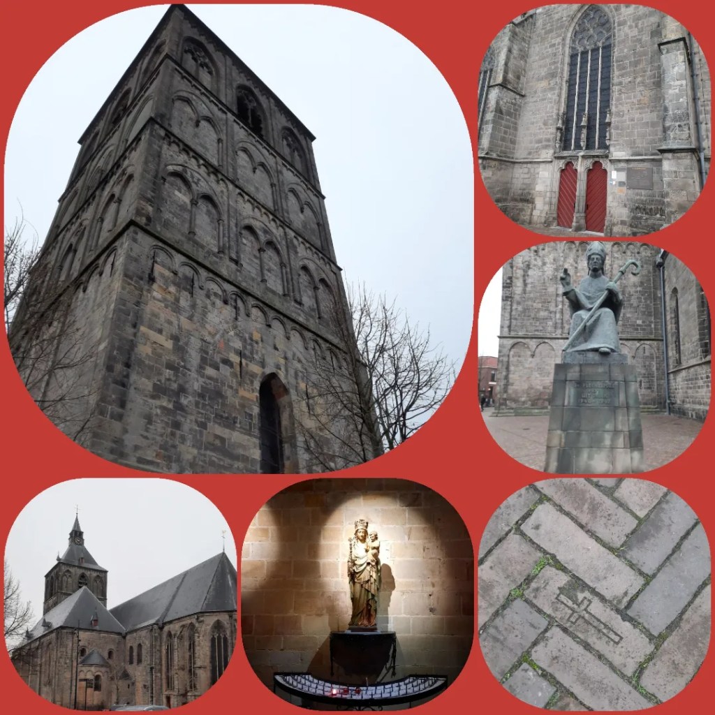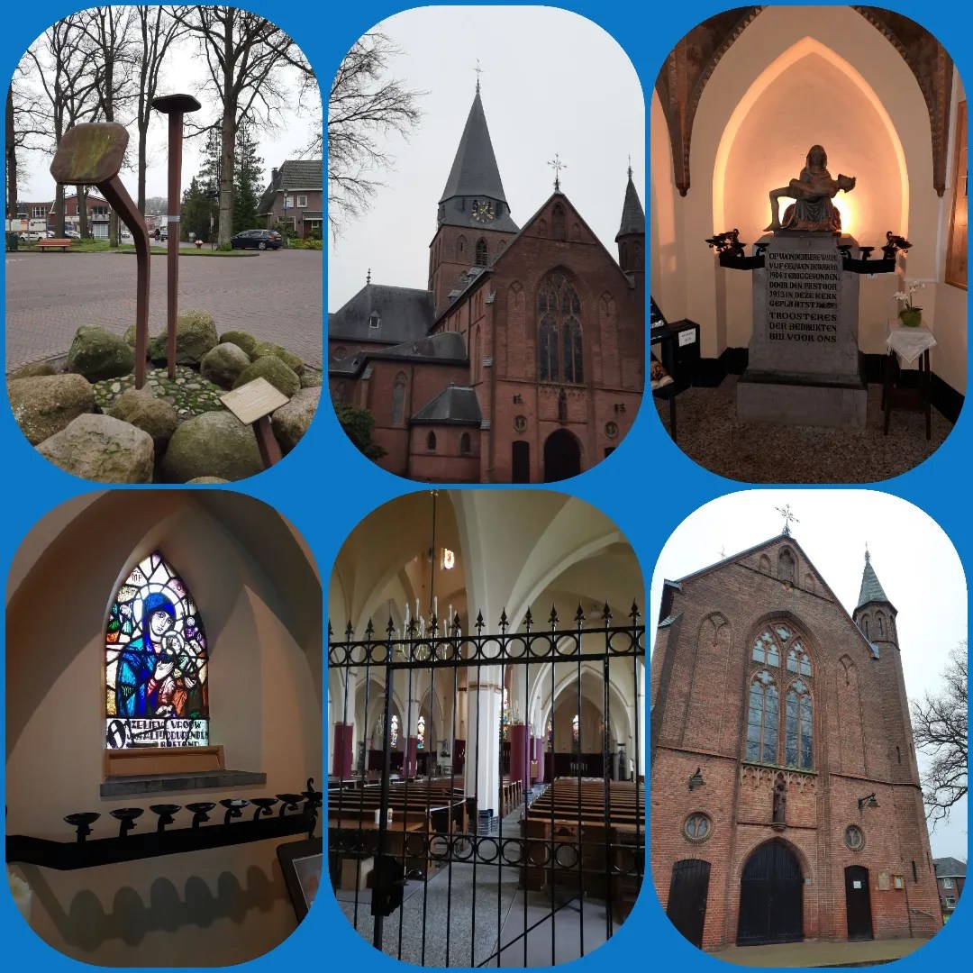 De stoere Romaanse Plechelmusbasiliek is het ommetje waard. De kerk is in de 13e eeuw opgetrokken in Bentheimer zandsteen en in de 14e eeuw in Gotische stijl uitgebouwd. In de massieve vierkante toren is de Mariakapel open en zo krijgen we iets te zien van het interieur. Op het plein voor de kerk een beeld van Plechelmus, een Ierse monnik die in de 8e of 9e eeuw naar Nederland kwam. Er wordt verteld dat keizer Karel de Grote bij hem heeft gebiecht… Op 30.000 steentjes van het plein is een kruisje ingebakken, ter herinnering aan het kerkhof dat hier vroeger was…