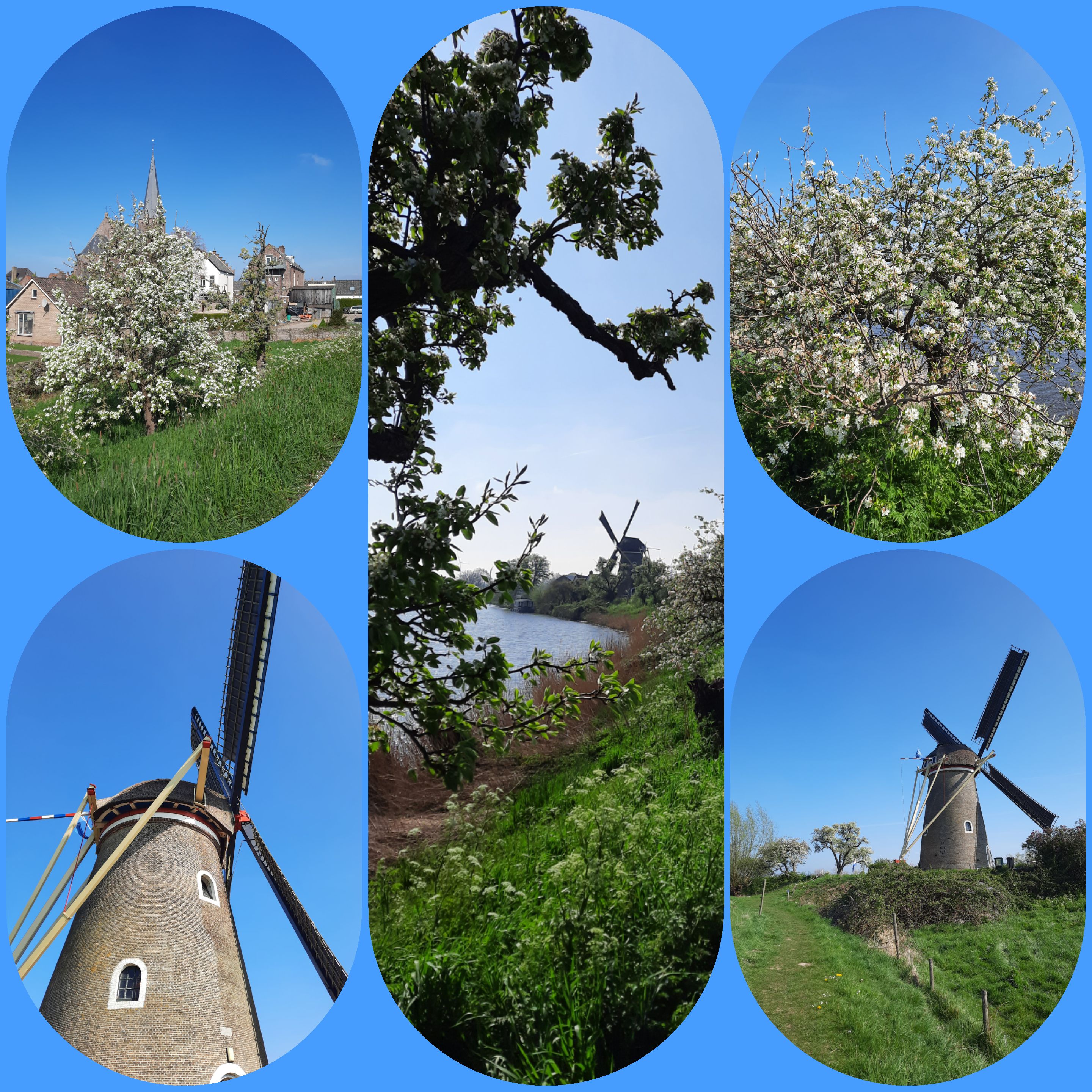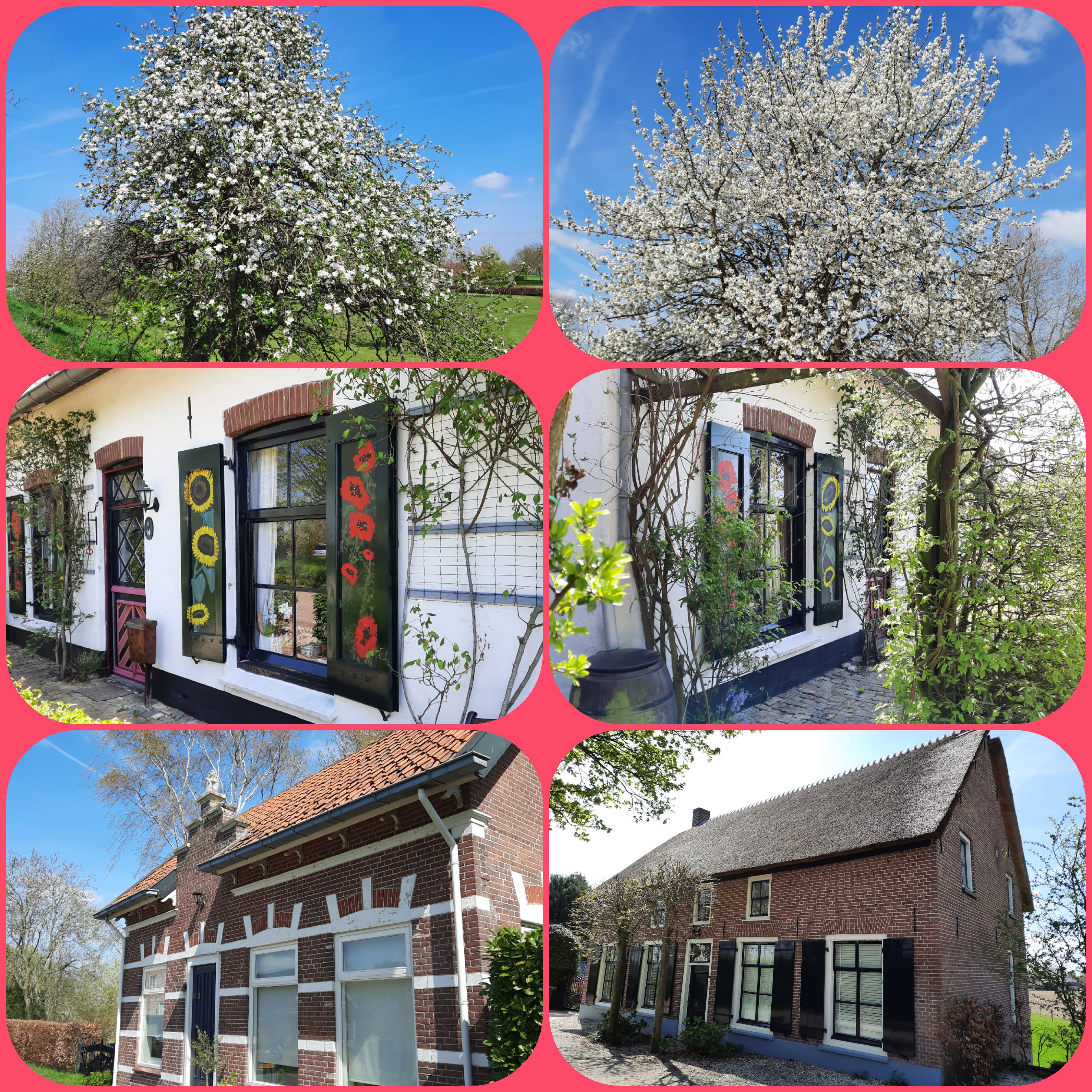 De Betuwse klei leent zich goed voor de appelteelt, maar vlak ook de peer, kers en pruim niet uit. Overal staan bloeiende bomen, sommige met stalen constructies om straks netten te spannen zodat de spreeuwen niet met de oogst gaan strijken.