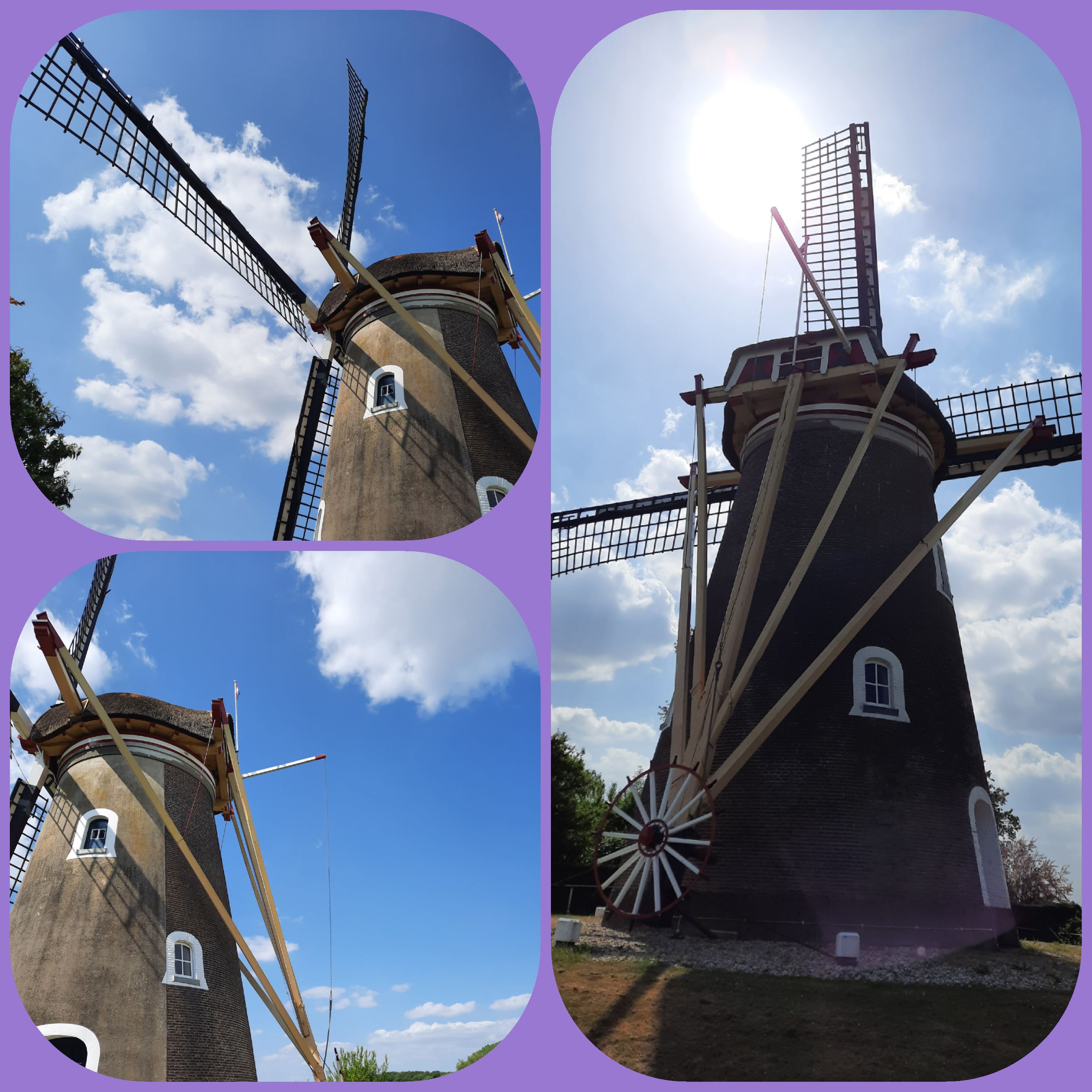 Verder langs de Linge naar Deil. Voorbij Deil staat al ruim 100 jaar de prachtige stellingkorenmolen De Vlinder te pronken. Ik zie een bord staan dat de molen open is. Het is nl. Nationale molendag. Dat laat ik me geen 2 keer zeggen. Vanaf de stelling kijk ik uit over de Linge. Mijn hoogtevrees speelt me wel parten, dus ik blij als ik weer beneden ben.