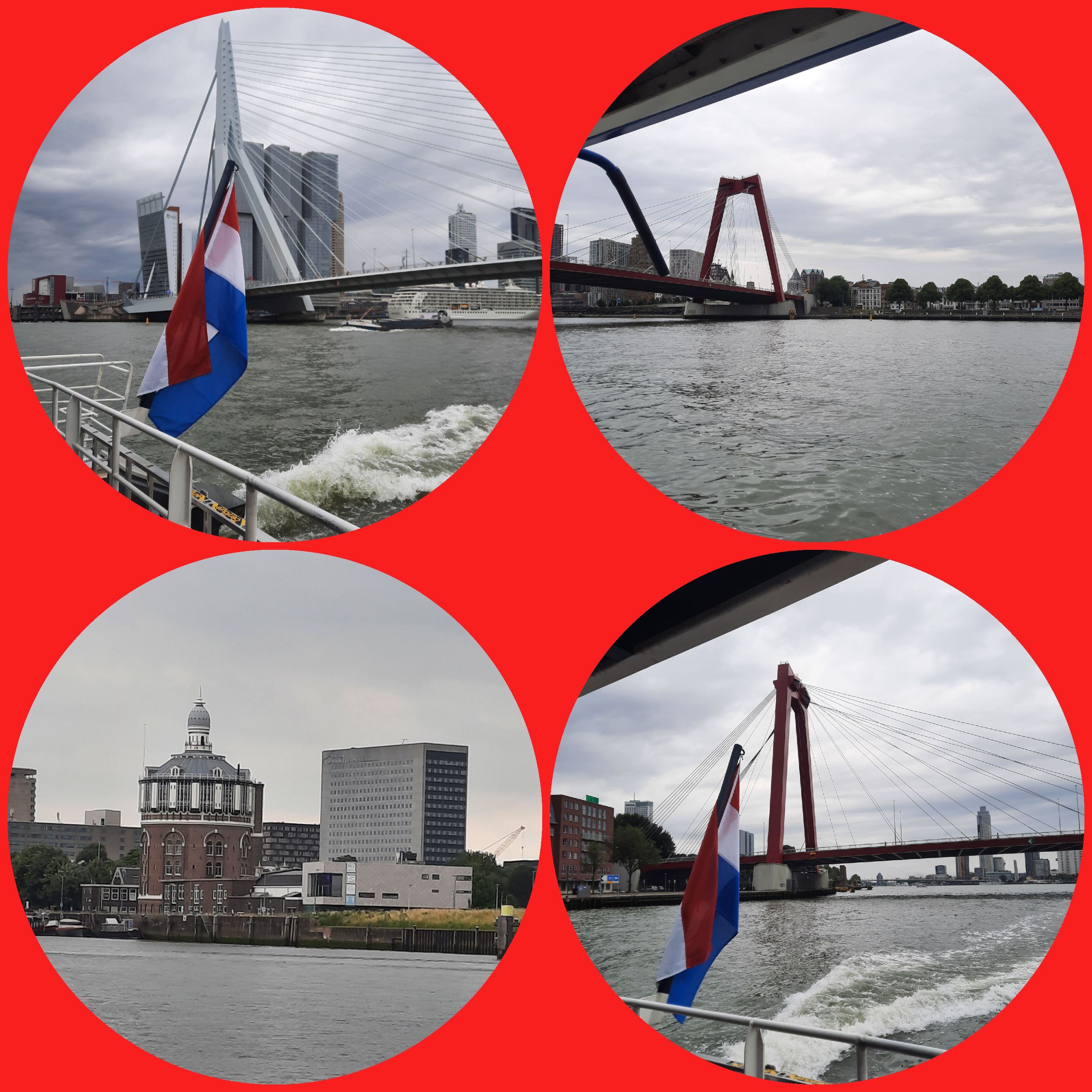 Tja, en hoe kom je dan bij die Maeslantkering. Nou, dat was weer eens zo’n gek idee van me. Om 5 uur ging de wekker en kwart voor 6 zat ik op de fiets. Bij Wadenoijen stond de kerk aan de Linge prachtig in de gloed van opgaande zon. In Geldermalsen de trein naar Dordrecht (fiets mag gratis mee) en in Dordrecht naar de Merwekade, waar ik met de waterbus naar de Erasmusbrug in Rotterdam voer (fiets ook gratis mee). En zo stond ik om 9 uur in Rotterdam. En toen op de fiets naar de Maeslantkering.