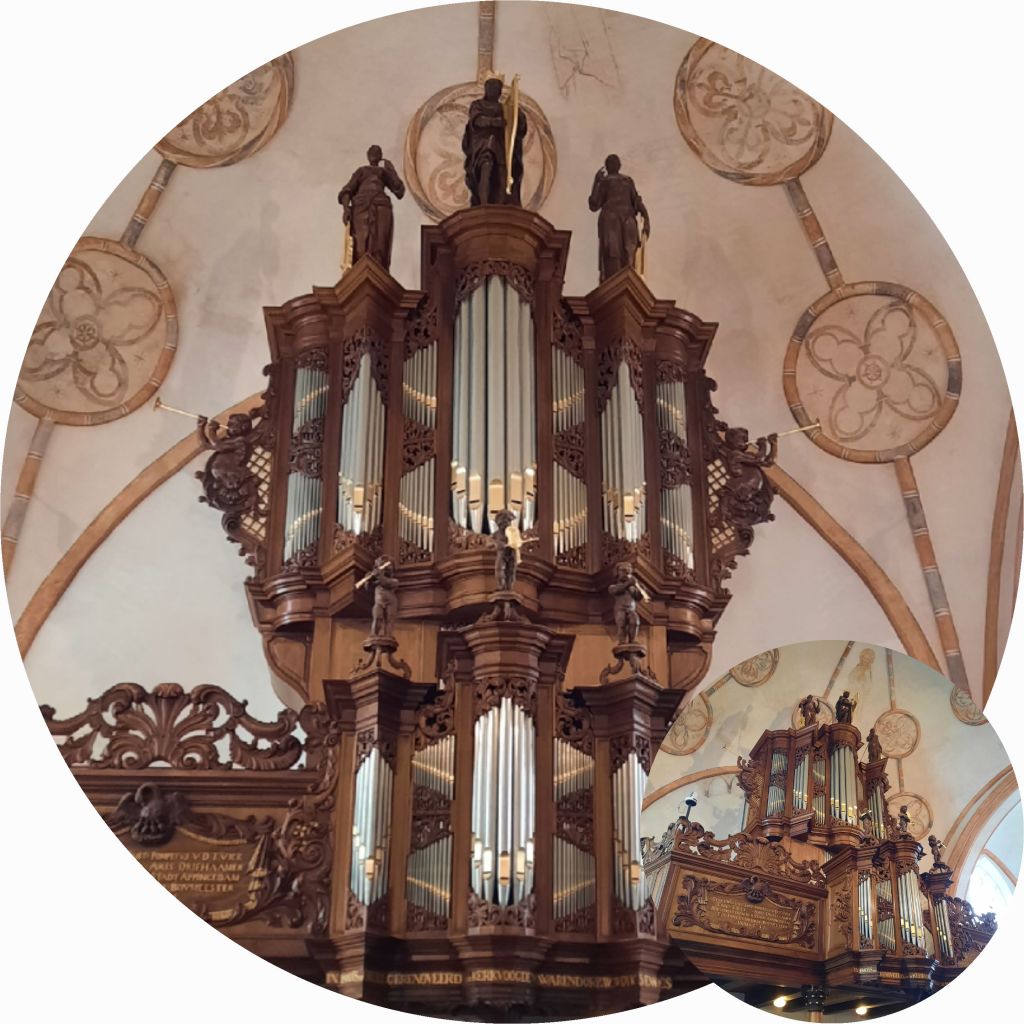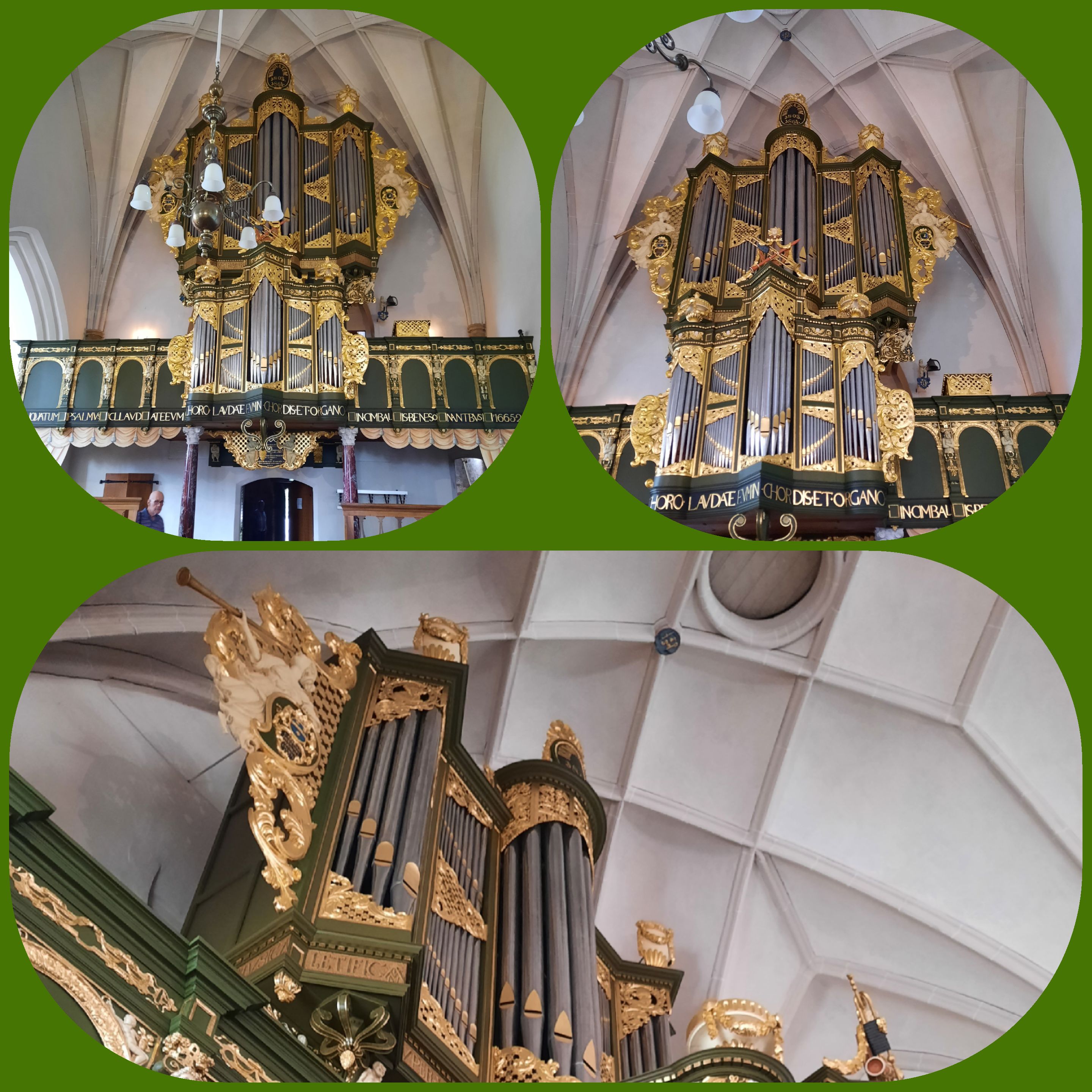 Het orgel schittert, de gouden versieringen steken fel af tegen de olijfgroene kleur van de kas. De kas is oud en stamt deels uit de 16e eeuw, het pijpwerk is nieuwer, uit de 18e eeuw. Sietze laat het orgel dansen met muziek van Michael Preatorius en sluit de demonstratie af met een improvisatie over psalm 9.
