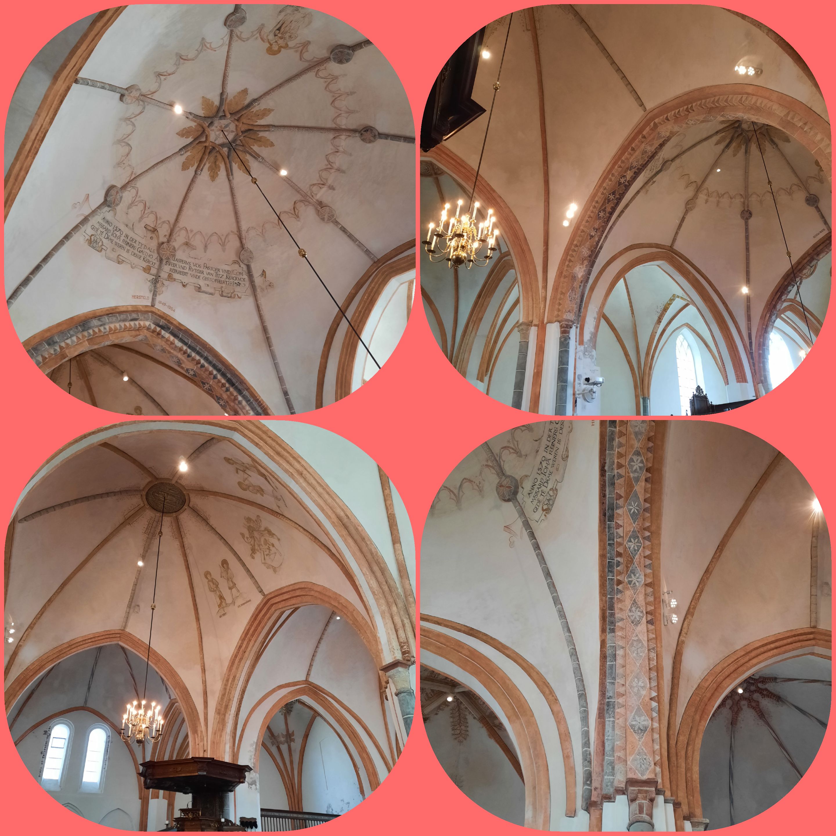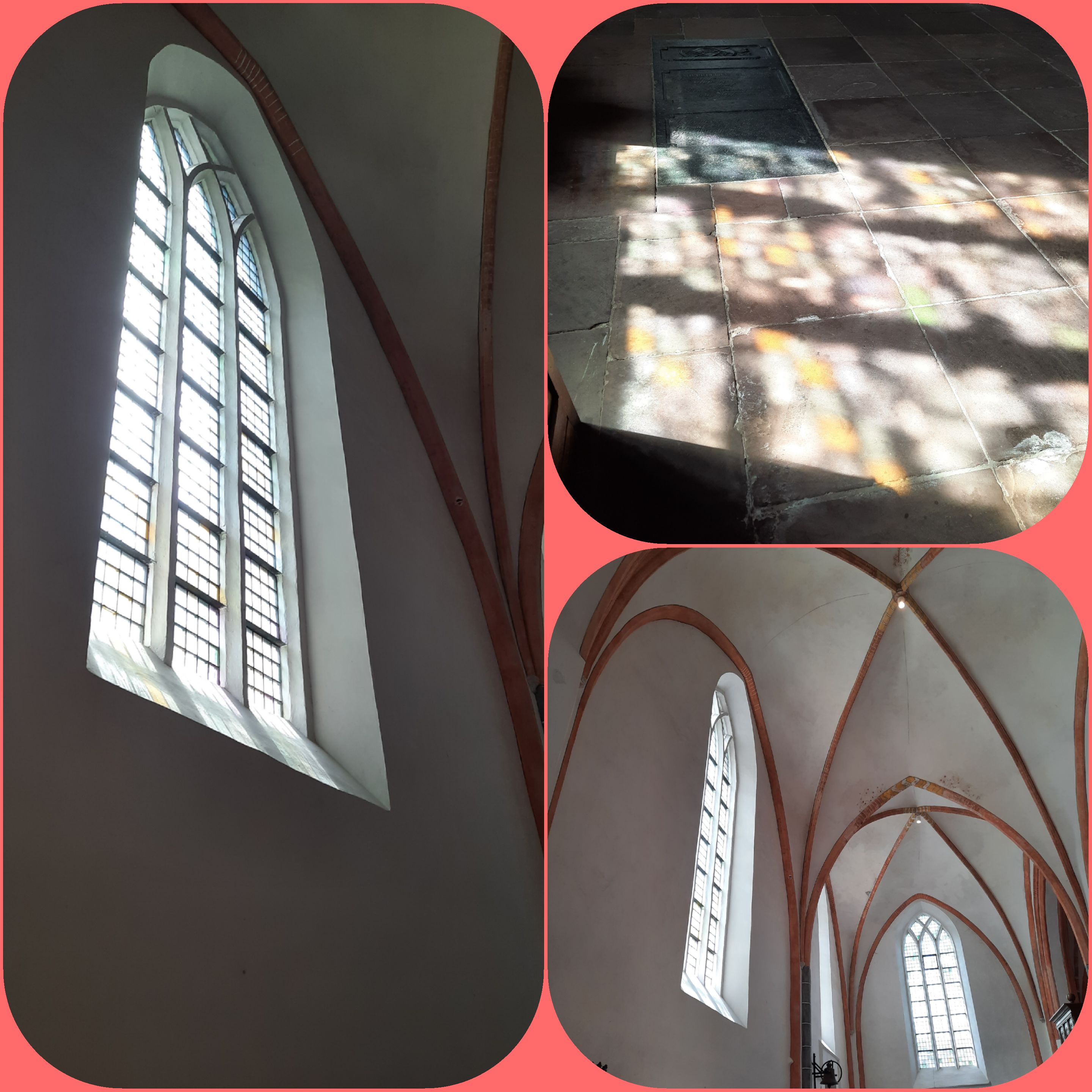 De kerk heeft prachtige gewelven en net als in Loppersum beschilderingen. En de typische rozerode kleur op de pilaren waardoor er een heel bijzondere sfeer hangt, zeker als het zonlicht door de ramen op de grond valt.
