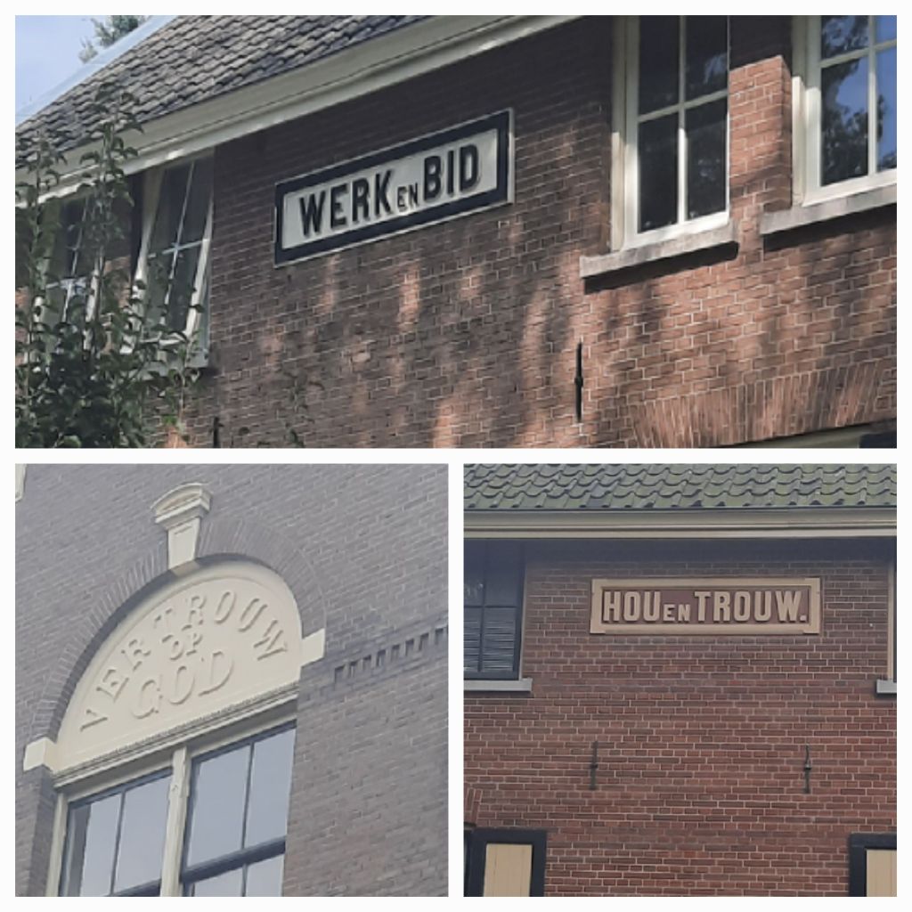 De maakbaarheid van het leven stond voorop. Wat de gevangenen hiervan vonden, was niet van belang. Ze werden onderweg naar de kerk of naar hun werk herinnerd aan waarom ze hier zaten. Vrijwel ieder huis heeft een moralistisch opschrift: humaniteit, flink en vlug, orde en recht, kennis is macht, werken is leven, arbeid is zegen… en werk en bid. Ik weet toch zeker dat het andersom moet zijn… Alles in een strak lettertype, dat inmiddels het handelsmerk van het dorp geworden is. Uitzondering: op de directeurswoning staat in sierlijke letters Klein Soestdijk en verroest, het lijkt er echt op.