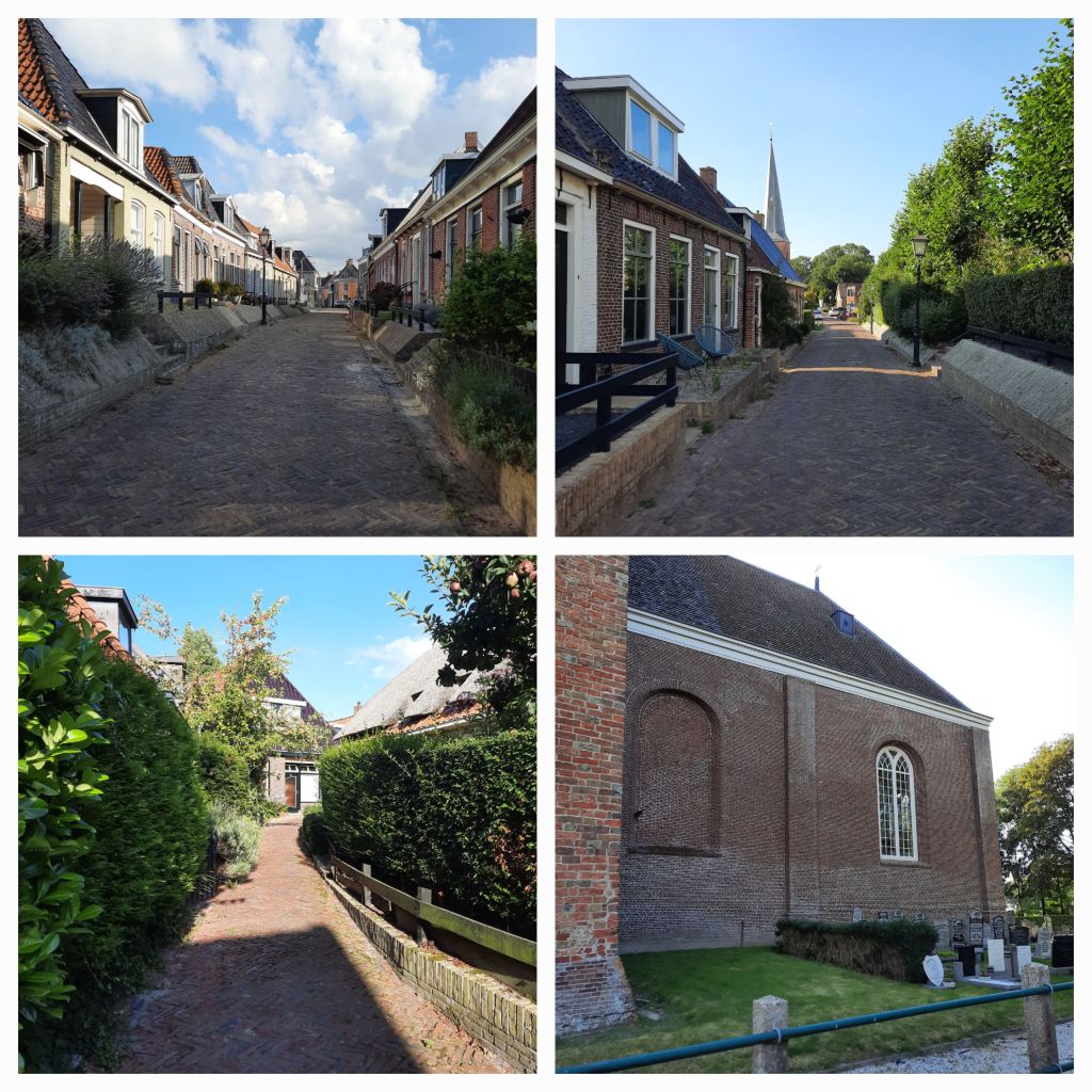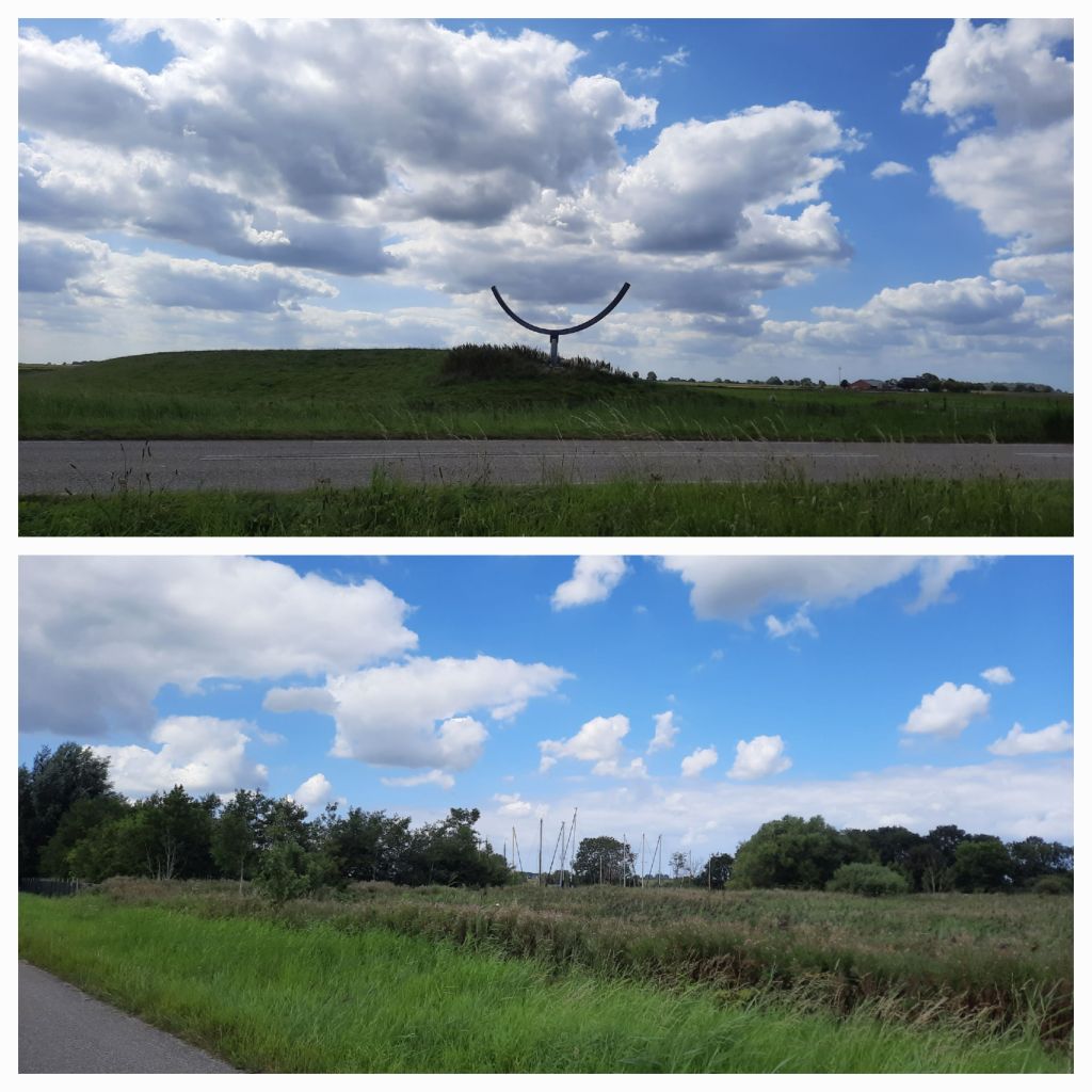 Bij Munnekezijl zit ik in Friesland. Het wordt steeds vlakker en leger. En rustiger. Ik zie grote stukken van oude dijken liggen. Bij Dokkumer Nieuwe Zijlen ga ik het jaagpad op langs het Dokkumer Grootdiep. Ik fiets over een mooi pad, maar ik denk aan de schepen die hier voortgetrokken werden, als er geen of te weinig wind stond of uit de verkeerde hoek. Door een paard, of als de schipper erg arm was door zijn vrouw en kinderen.