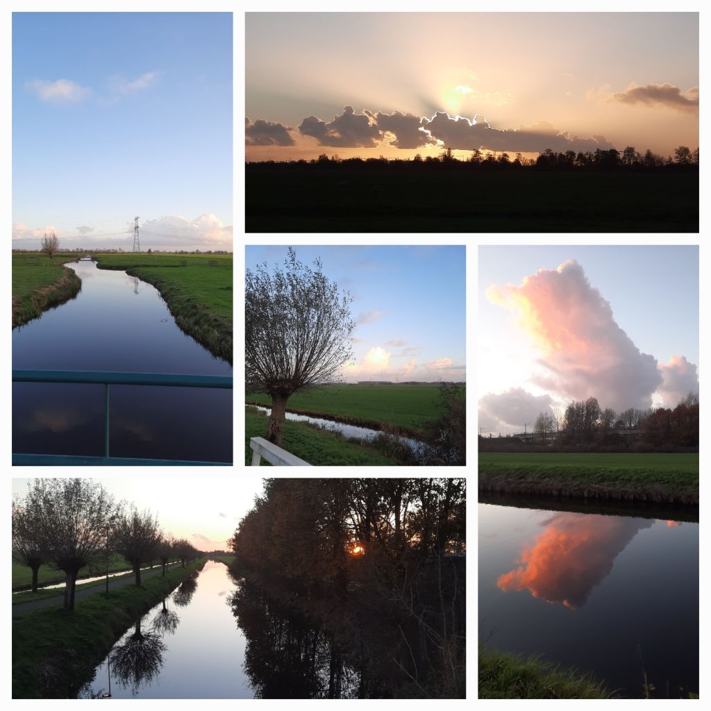 Langs de Diemerbroek loop ik op Woerden aan. De zon zet alles in een prachtige gloed, de wind is vrijwel gaan liggen, fantastisch zijn de wolkenluchten.