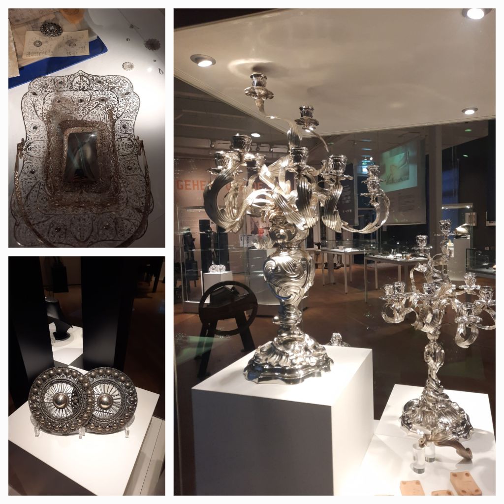Een verdieping hoger ‘Het geheim van de smid’: ik krijg informatie over de diverse technieken die gebruikt worden bij het verwerken van zilver. Gieten, drijven, filigrain, hameren, zagen, galvanisatie. Ik zie voorwerpen die ik herken: een tabaksdoos (mijn opa had zoiets), een loddereinflesje (ik heb er eentje van mijn oma). En Zeeuwse knopen, klein en groot. Ik had ooit een ringetje daarvan.