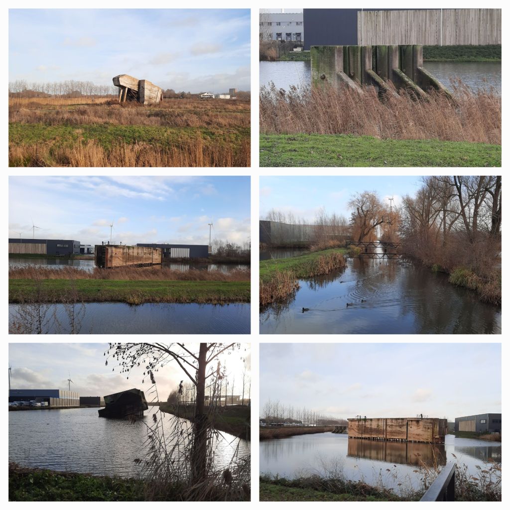 - Ik passeer de aansluitingen van de Houtense Wetering en de Schalkswijkse Wetering op het Lekkanaal. Beide kanalen werden ooit met een sluis afgesloten. Die van de Houtense is er niet meer, die van de Schalkwijkse nog wel. Het staat als objet trouvé (gevonden voorwerp) in een grote vijver, samen met een aantal kazematten. Het lijken wel een soort buitenaardse mastondonten, zo helemaal uit hun element.