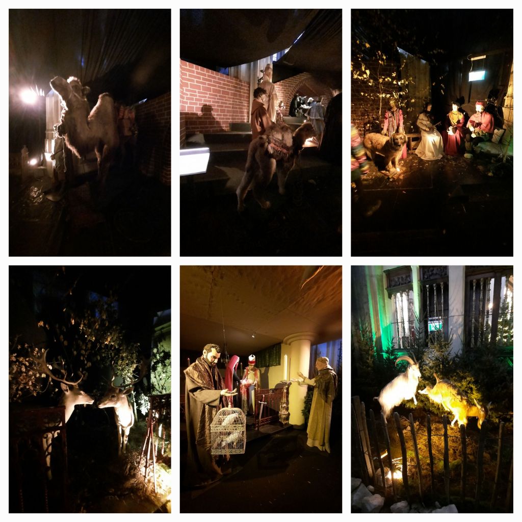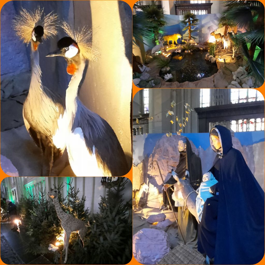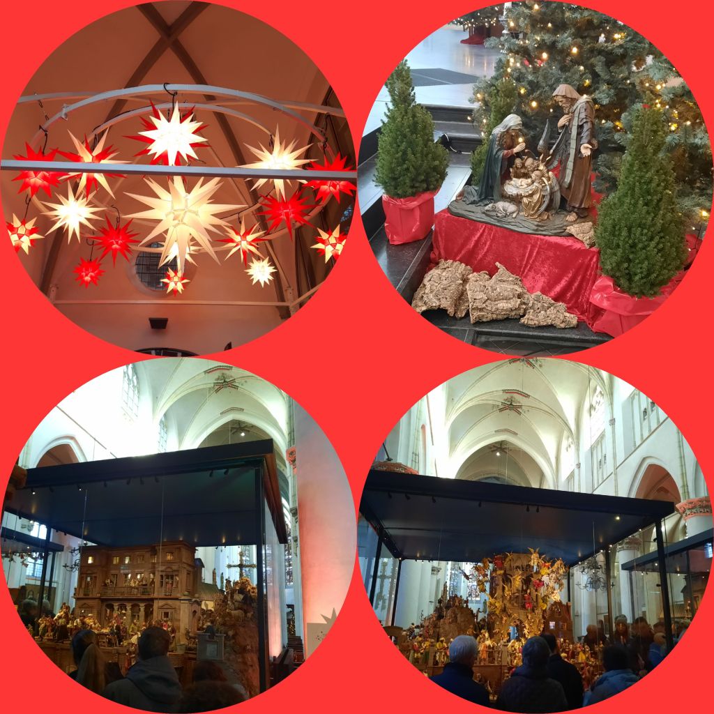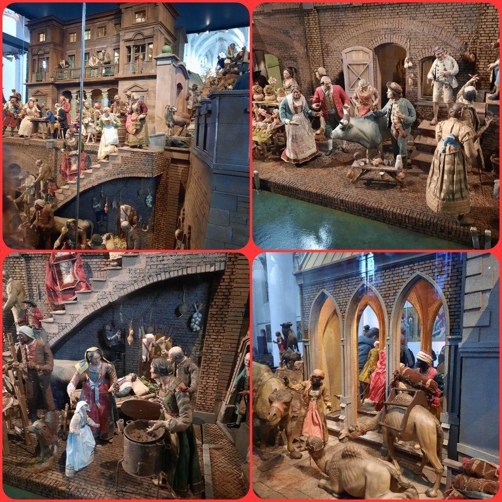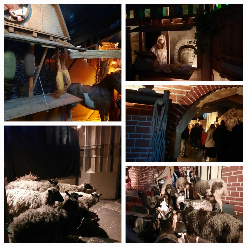 Ik stap in de trein en ga naar Den Bosch, naar een totaal andere kerststal. Rondom het koor van de grote Sint Jan is een middeleeuwse straat gebouwd met winkeltjes (een slager, een bakker, een groenteboer, een wijnhandelaar) met levensgrote poppen én opgezette dieren, Daarna komen we bij de herders met geiten en schapen (opgezet) en dan midden achter in de kerk de kribbe met Jezus. Rechts staan de herders met hun schapen op de trappen, klaar om te aanbidden, links komen de wijzen net aan met hun geschenken. Opgezette kamelen maken de scène compleet.