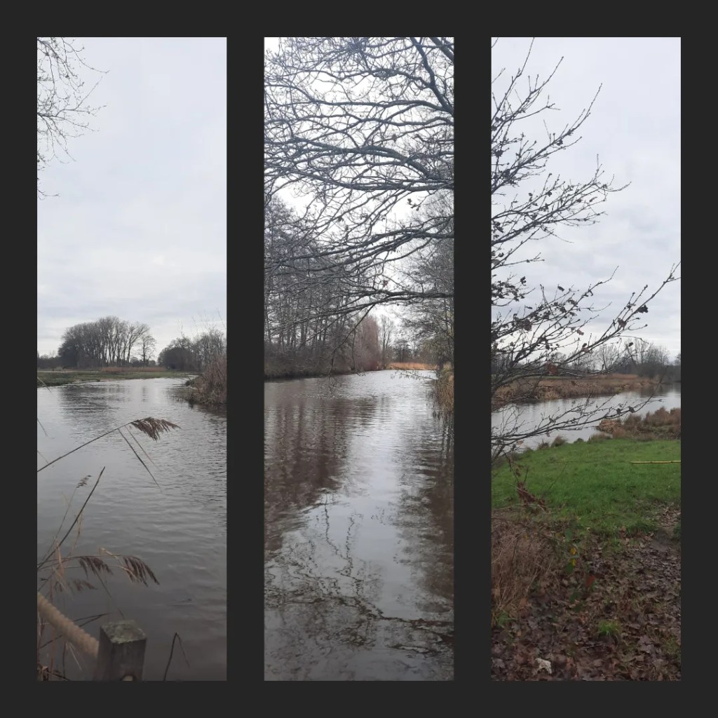 En wat een pech, een omleiding. De Regge heeft al heel wat keren te maken gehad met menselijk ingrijpen, vooral kanalisatie, ten bate van de scheepvaart en waterafvoer. Nu wordt dit deels ongedaan gemaakt, vandaar de omleiding. Uiteindelijk komen we wel bij de Regge uit en op een bankje aan de oever genieten we van onze eerste pauze en het uitzicht over dit prachtige gebied.