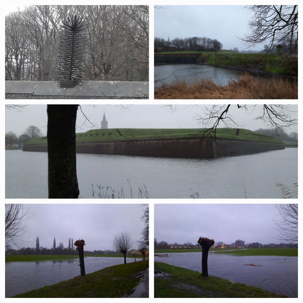 Mijn ijdele hoop op droog weer vervliegt zodra ik buiten kom. Toch waag ik me aan het Waterlinieommetje. Ik loop over de tweede wal om de hele vesting heen. Aan het eind zie ik iets van hoe een inundatie er uit moet zien. Door de regen treden slootjes buiten hun oevers en waar is nu water en waar land? De eenden maakt het niets uit.