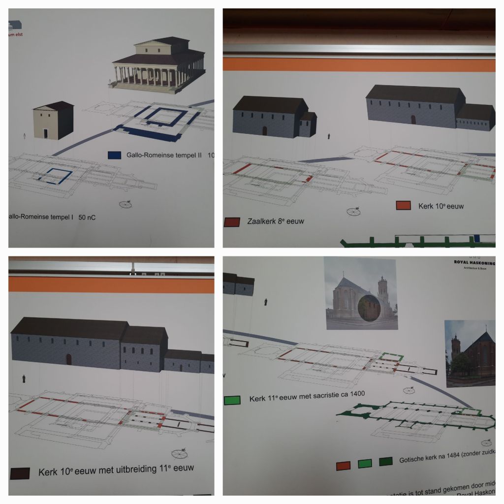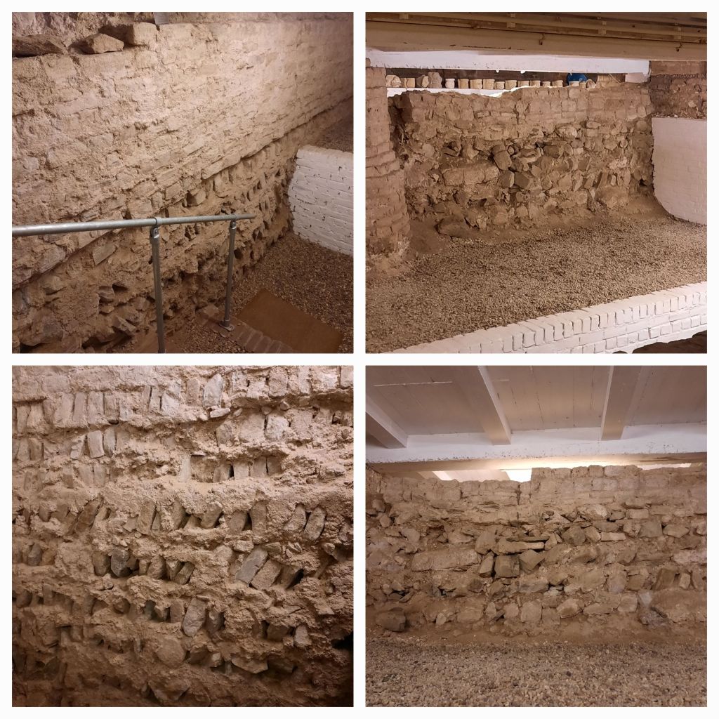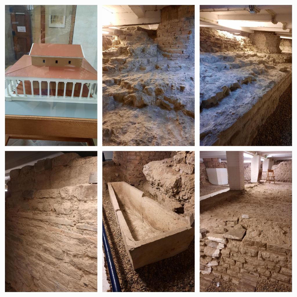 Met een wenteltrapje dalen we af naar die tijd. We staan onder de kerkvloer, overal stenen. We zien de buitenmuur van de tempel uit 100 en na een kleine afdaling staan we bij de vloer van de cella (het heiligdom) van de eerste tempel. Onze gids wijst ons op het prachtige metselwerk van de Romeinen en op het verschil met dat van de kerk uit de 8e eeuw. Het rommelige metselwerk met de verdwenen specie steekt schril af. Heel bijzonder is ook de traslaag van de tempel. Door deze laag in het fundament kon het grondwater niet optrekken. De stenen staan schuin verticaal tussen de los aangebrachte specie, zodat water weg kan vloeien. De fundamenten van de tempels werden bij de bouw van de kerken in later eeuwen hergebruikt. Eén van de pilaren van de 15e eeuwse kerk rust nog op het fundament met eikenhouten palen uit de 1e eeuw.