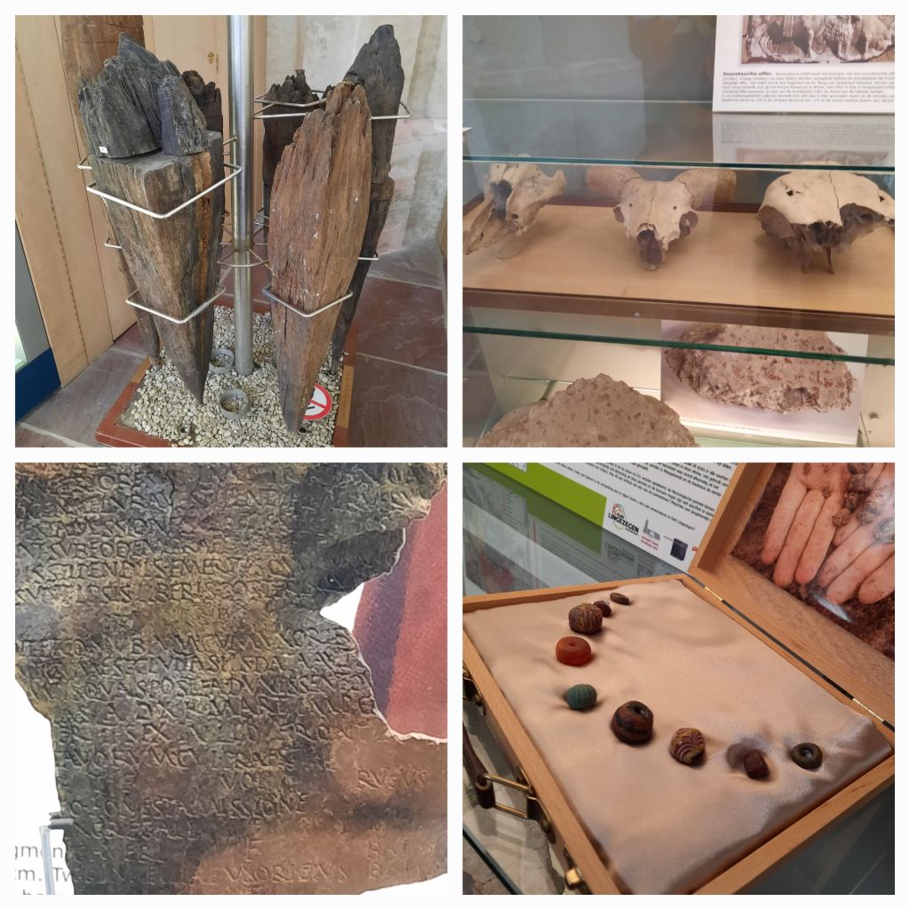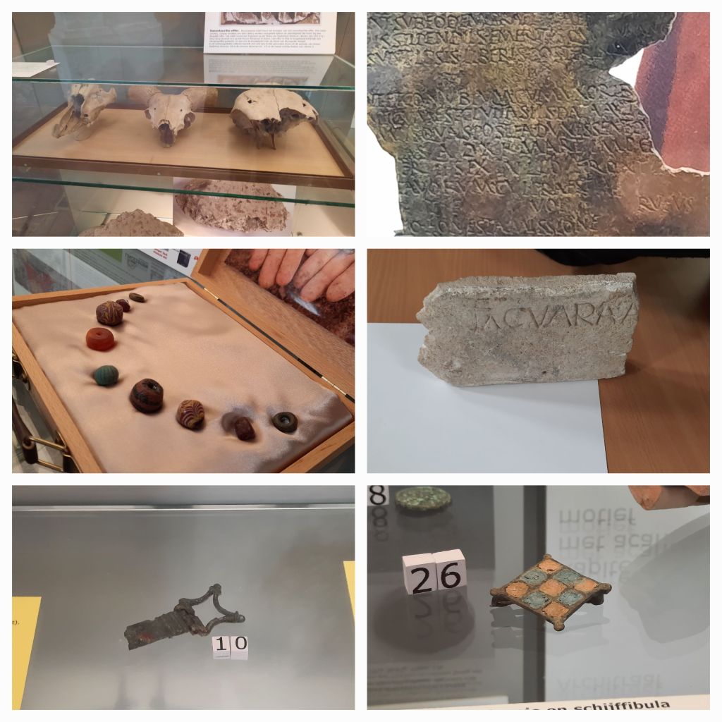 Er ligt een kleine, maar prachtige fibula, een Romeinse speld, maar ook liggen er prachtige kralen uit de Middeleeuwen. Rozenkransen, een haarnetje van een kind, delen van de beschilderde muren uit de cella, stukken van de zuilen.