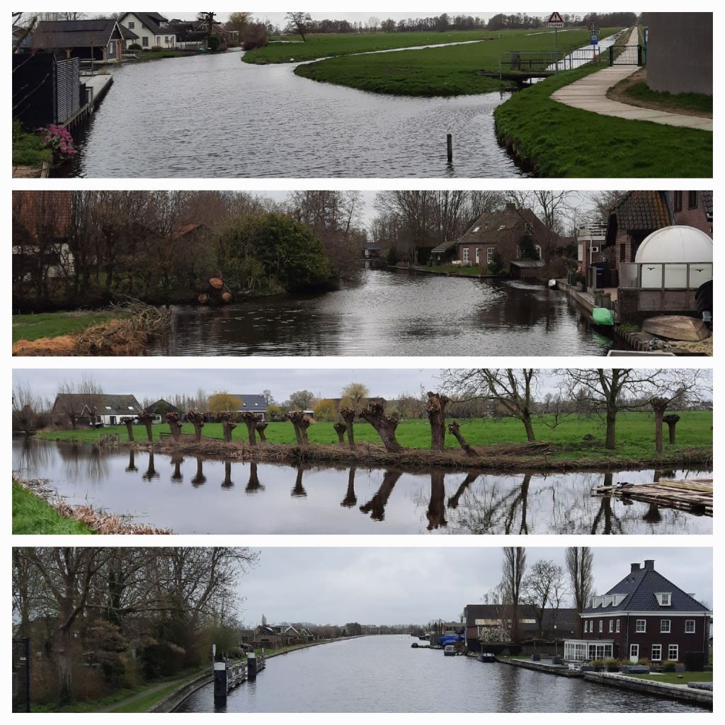 Ik loop het lintdorp helemaal uit. Jammergenoeg is het erg druk met verkeer, maar ik geniet van alles wat er te zien is. En toch nog vrij plotseling sta ik aan de oever van de Oude Rijn. Ondanks dat ik vanwege de afsluiting van vanmorgen een veel langere tocht wandel, besluit ik toch naar Zwammerdam te lopen.