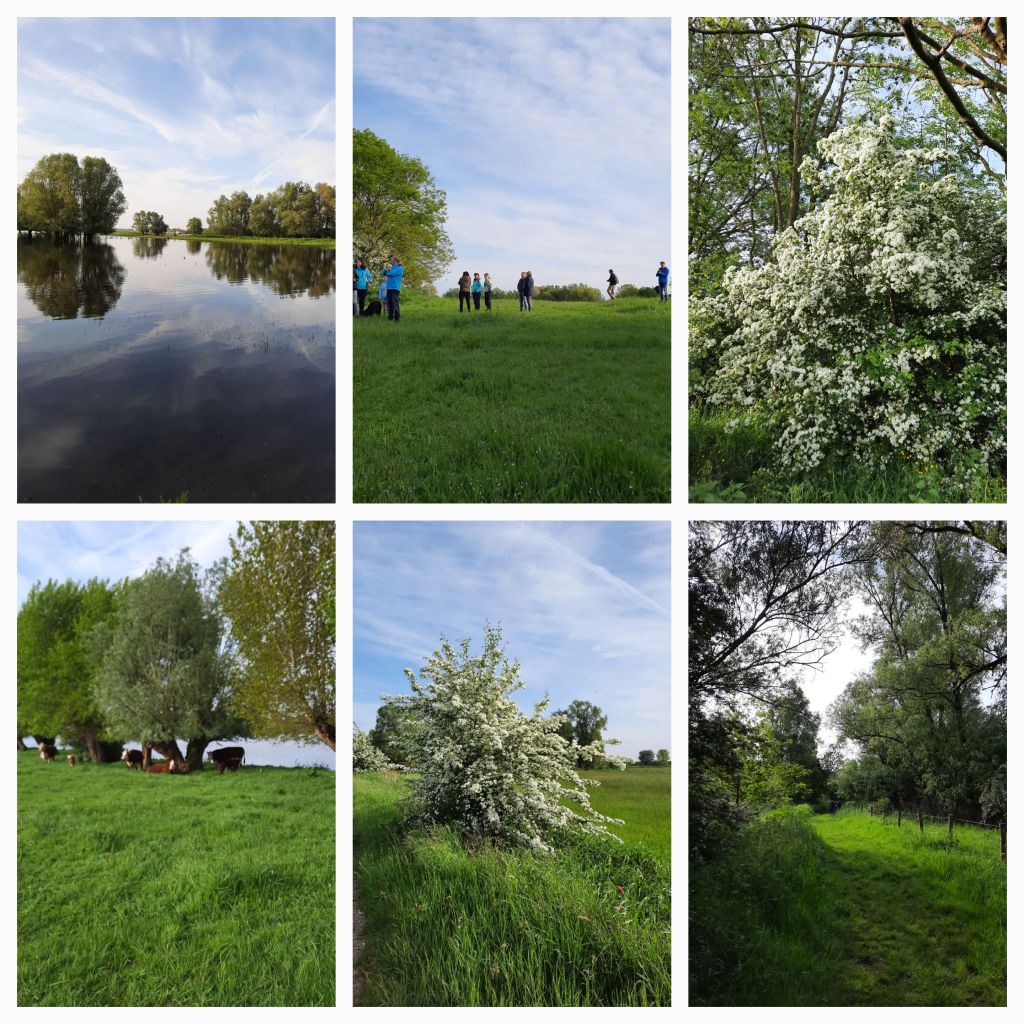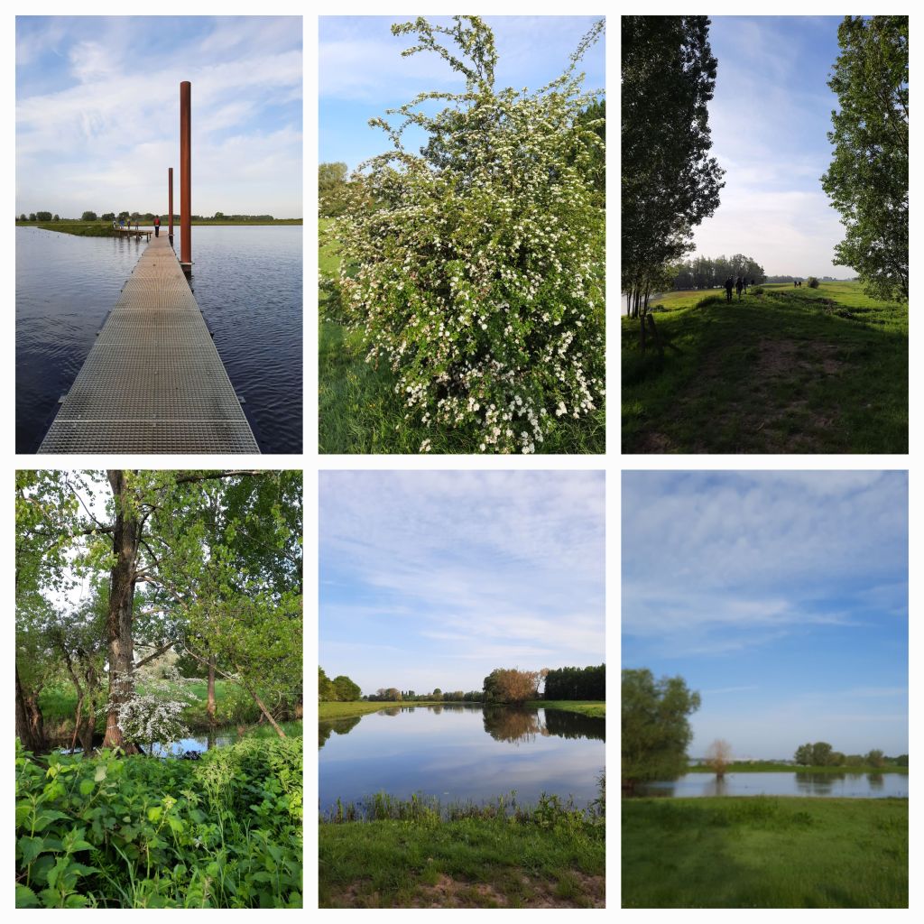 Het was koud, veel zon, sluierbewolking en de Heesseltsche uiterwaarden zijn als altijd mooi. De meidoorns in volle bloei, het fluitekruid, de boterbloemen, de kamille. Een zwaan ligt stil op een waterplas en heeft een vrijwel rimpelloos spiegelbeeld. De knotwilgen staan markant langs het water. En zo vroeg zijn de kleuren zo mooi. Boven ons zingt een leeuwerik.