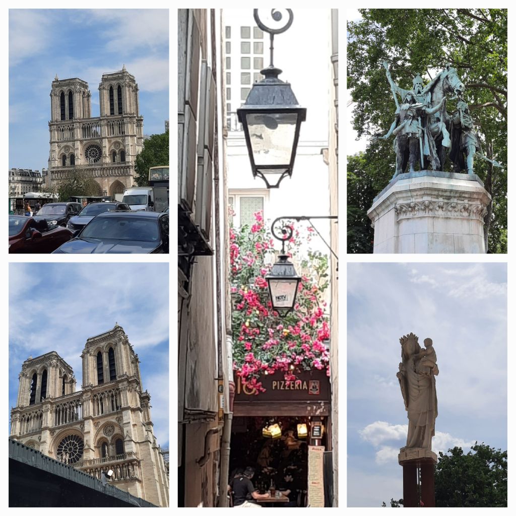 Na de lichte lunch loop ik naar de Notre-Dame. Na de brand van 2019 kun je niet meer de kerk in. Het gebouw staat in de steigers, maar het westwerk met de beeldbepalende torens is goed te zien. Opzij staat een rank Maria-beeld op een zuil en daarachter een groen verweerd ruiterbeeld van Karel de Grote, afgebeeld als een soort woesteling, met snorrebaard, vergezeld van twee even woest uitziende dienaren.