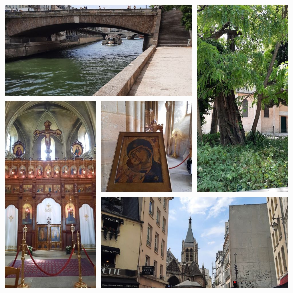 Langs de Seine loop ik naar de Saint-Julien-a-Pauvre, een Romaanse kerk, zeldzaam in Parijs. Nu in gebruik als Grieks-orthodoxe kerk, maar ooit de kerk waar bestuurders van de Sorbonne samenkwamen. Vlak erbij een pseudo-acacia, geplant in 1601, enigzins wrakkig maar volop in blad, omringd door nieuwe loten.