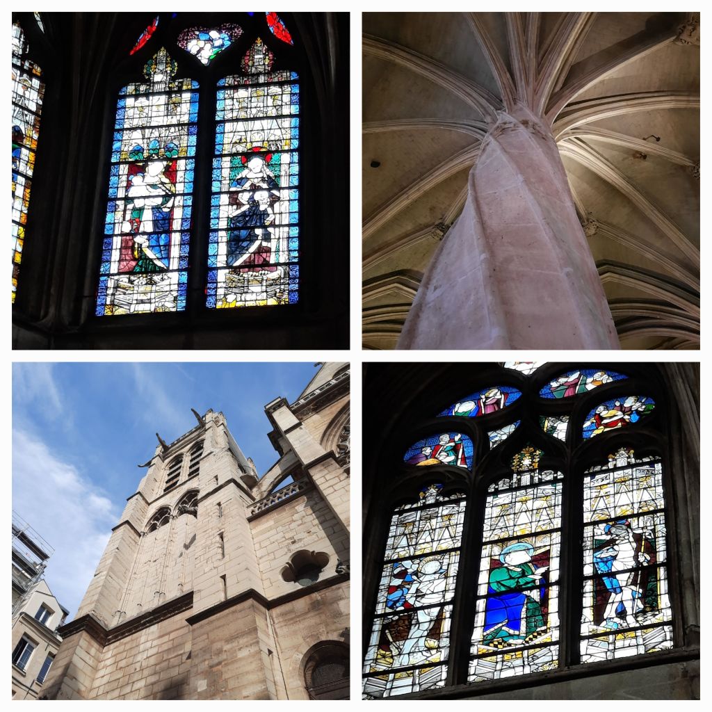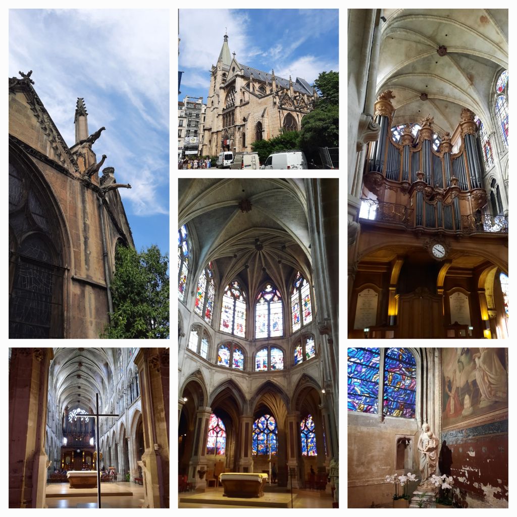Aan de overkant van de straat de Saint-Séverin, waar het eerste concert plaats vindt. Deze kerk is in de 11e eeuw gebouwd als vervanger van een door de Vikingen verwoeste basiliek. De kerk is vrij klein maar wel breed. In de loop der eeuwen is de kerk uitgebreid met zijbeuken met als slot de 15e eeuwse kooromgang in flamboyant gotische stijl. Je kunt het verschil in bouwstijlen goed zien. De eerste drie pilaren van het schip zijn anders dan de rest. En die van de kooromgang stellen een soort palmbomen voor met een bijzondere getordeerde ofwel gedraaide pilaar middenachter.