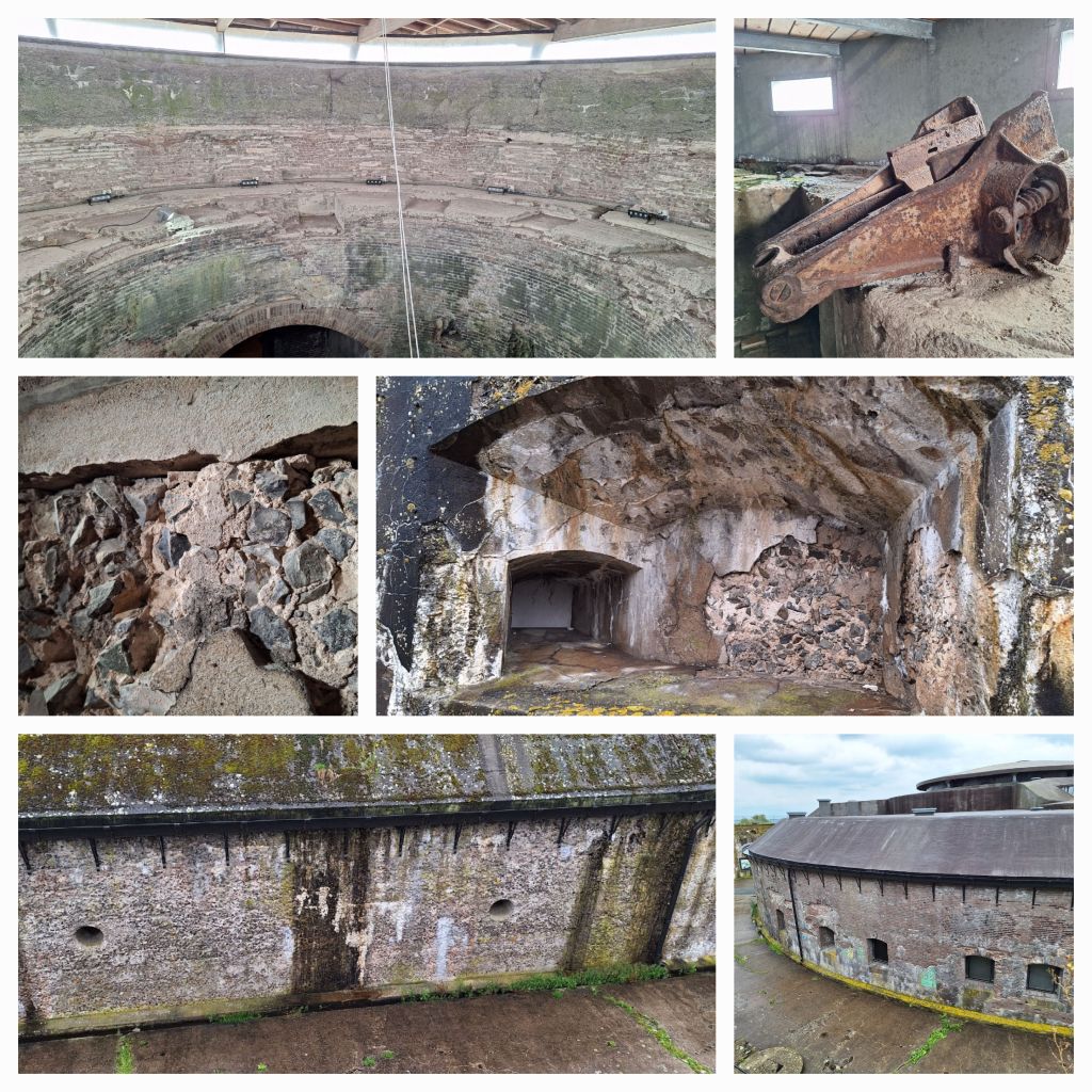 Beton, met basaltstukjes erin, en baksteen waren de bouwmaterialen. Meters dikke daken en muren werden gebouwd. Twee gigantische stalen geschutskoepels met ieder twee grote kanonnen, bereik tot 10 km.
