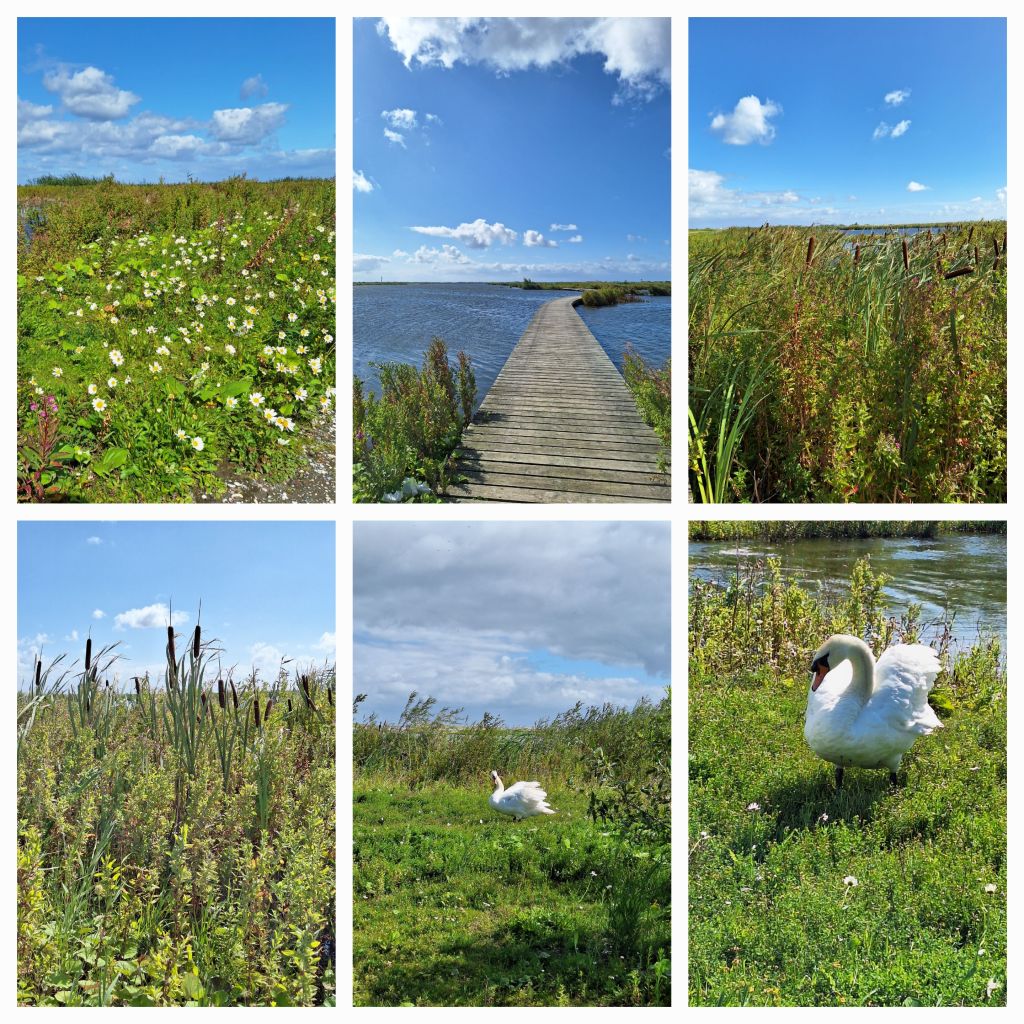 Het is hier heel stil en vandaag ook heel rustig. Dat zorgt voor mooie ‘ontmoetingen’ met de vogels. Een jong waterhoentje schiet gehaast voor mij het pad over, een gans met een wrakke vleugel loopt platvoetig voor me uit, een plevier rent van links naar rechts over de dam op zijn ragfijne pootjes, een zwaan staat op het land zich te soigneren. Eerst vleugels uitwapperen en dan veren recht strijken. Eenden dobberen op het water, futen duiken onder, allerlei meeuwen zwenken heen en weer en zwaluwen scheren rakelings over me heen.