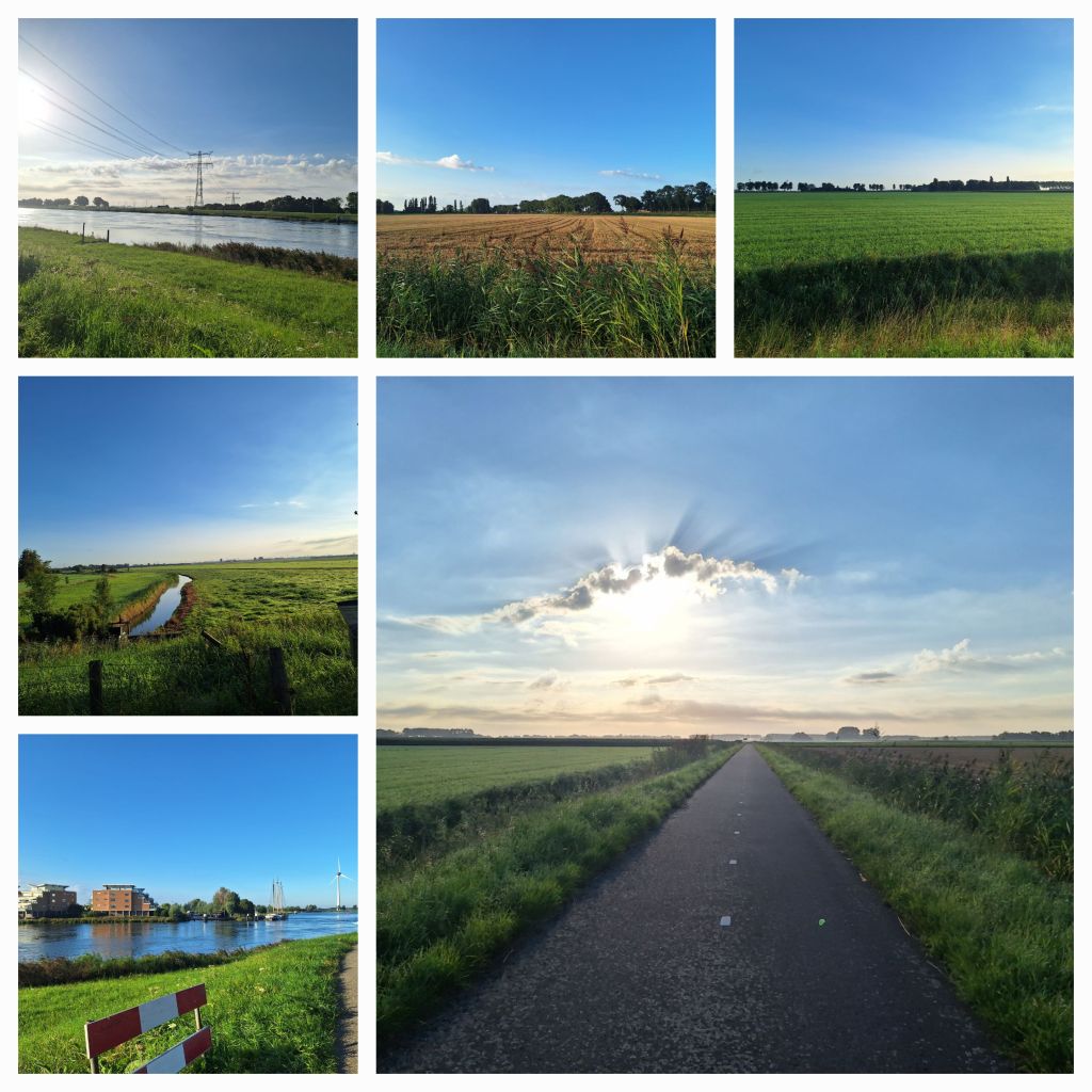 Ik was vanmorgen erg vroeg opgestaan, en ja, ik zet vrijwel iedere ochtend een wekker. Vanmorgen dus om 7 uur ontbijt en om kwart voor 8 was ik op pad. Gisteren had ik kramp in mijn kuit gekregen, net bij de laatste kilometer. Vandaar dat ik vandaag de tijd wil hebben. Gelukkig is de kramp nu weg, dus op pad door deze mooie ochtend, over de dijken, terwijl overal de oogst in gang is. Terzijde: oogst is een verbastering van augustus.