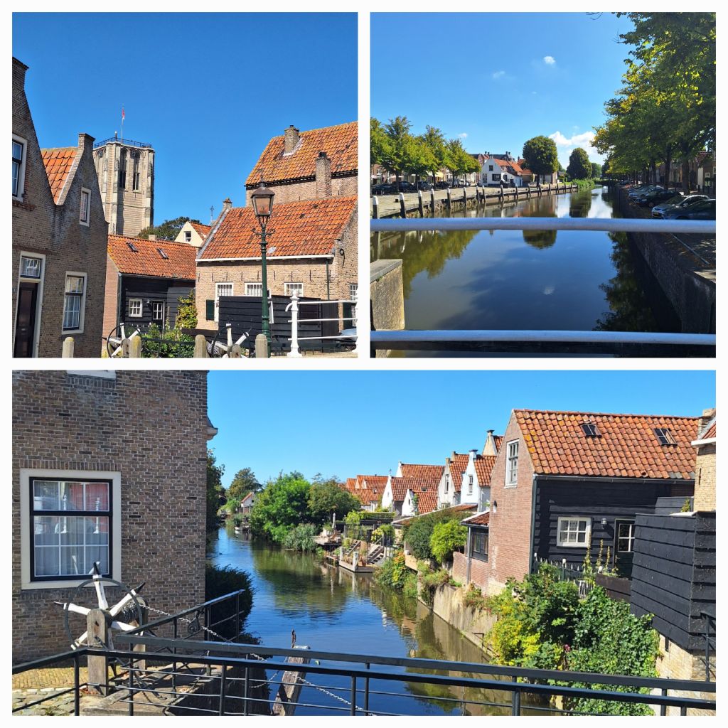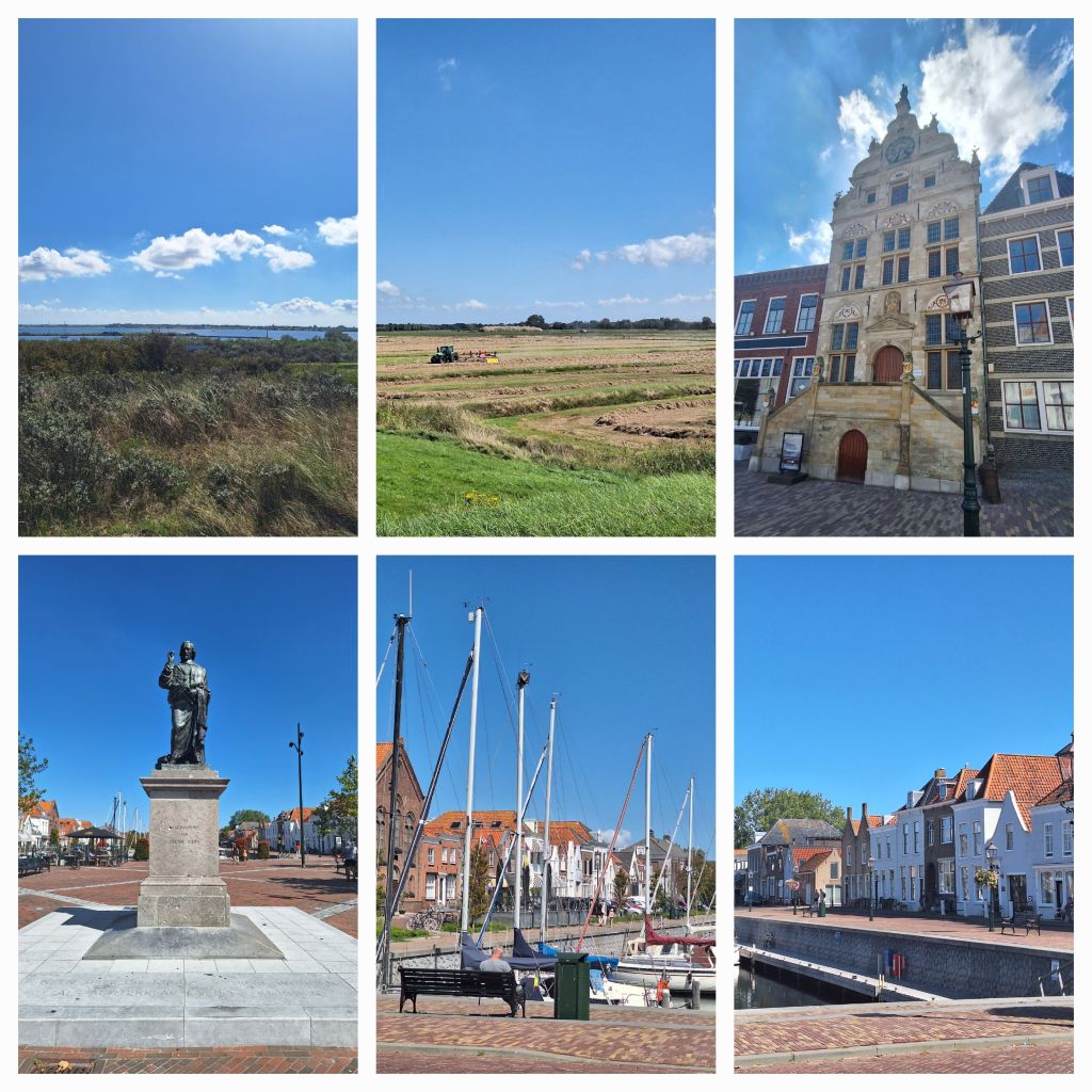 Ik fiets via Brouwershaven naar Zierikzee en geniet nog steeds van het uitzicht vanaf de vele dijken en dijkjes, het donkerblauwe water, de felblauwe lucht, het binnenhalen van de oogst.