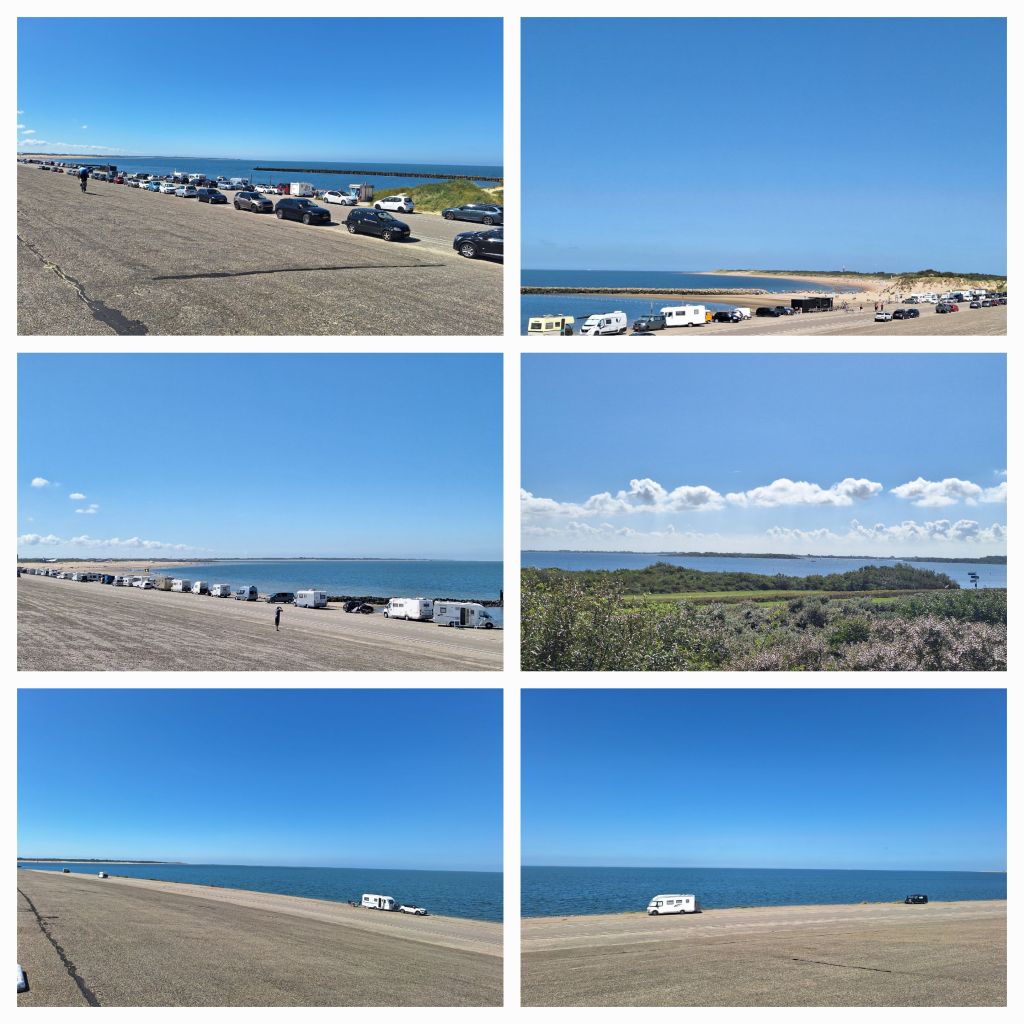 Nou, dat is met recht een DAM! Hij ligt er plompverloren bij, vind ik. Ik mag gelukkig helemaal bovenop fietsen, maar veel schoonheid is er niet aan. Rechts van me is het een parkeerplaats voor alle strandgangers, links beneden raast het verkeer. Het uitzicht is wel prachtig.