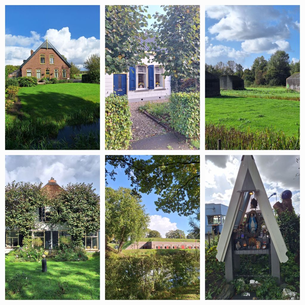 De drukke weg vergezelt me rechts. Links is het prachtige veenweidelandschap te zien, lange stroken land met brede sloten, op de kop de voormalige boerderijen, her en der de groepsschuilplaatsen, felblauwe lucht met spierwit aangelichte wolken. En plotsklaps weer regen. Dus de paraplu maar weer bovengehaald.