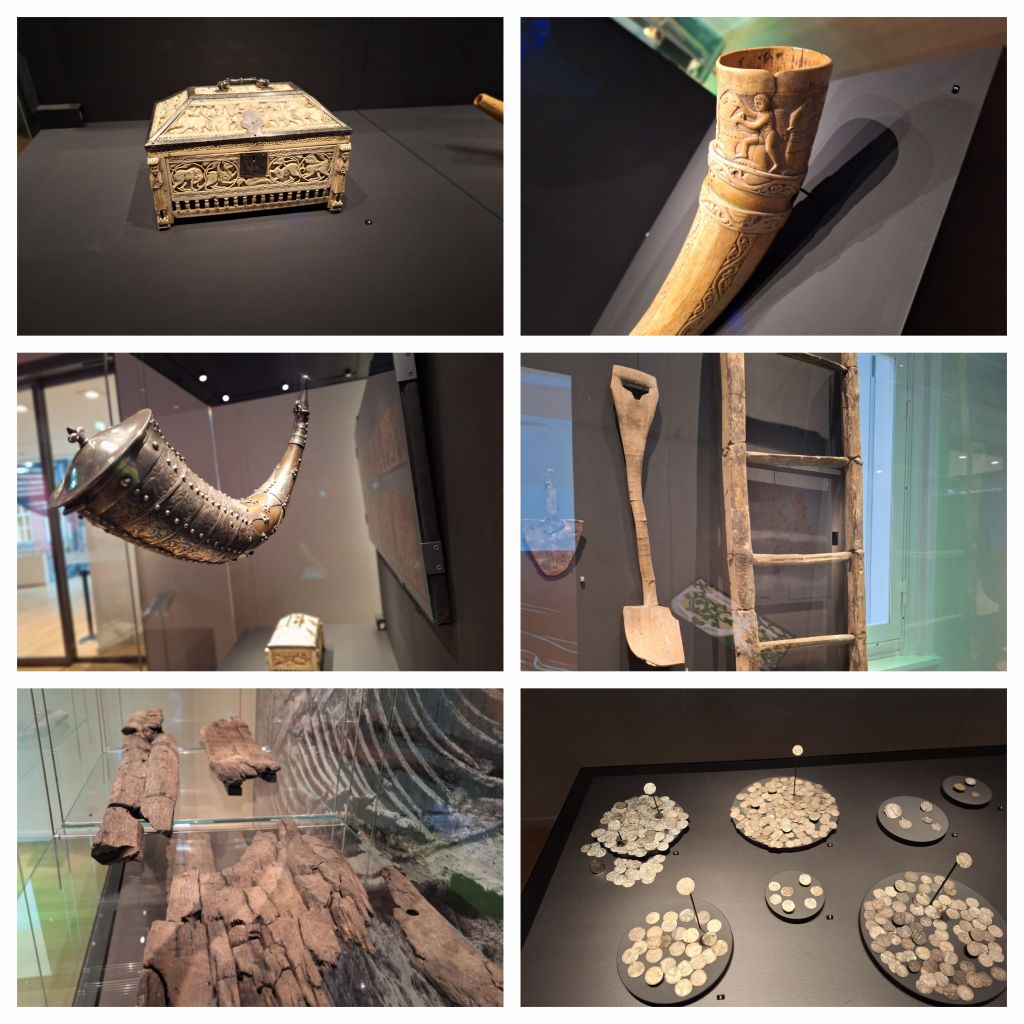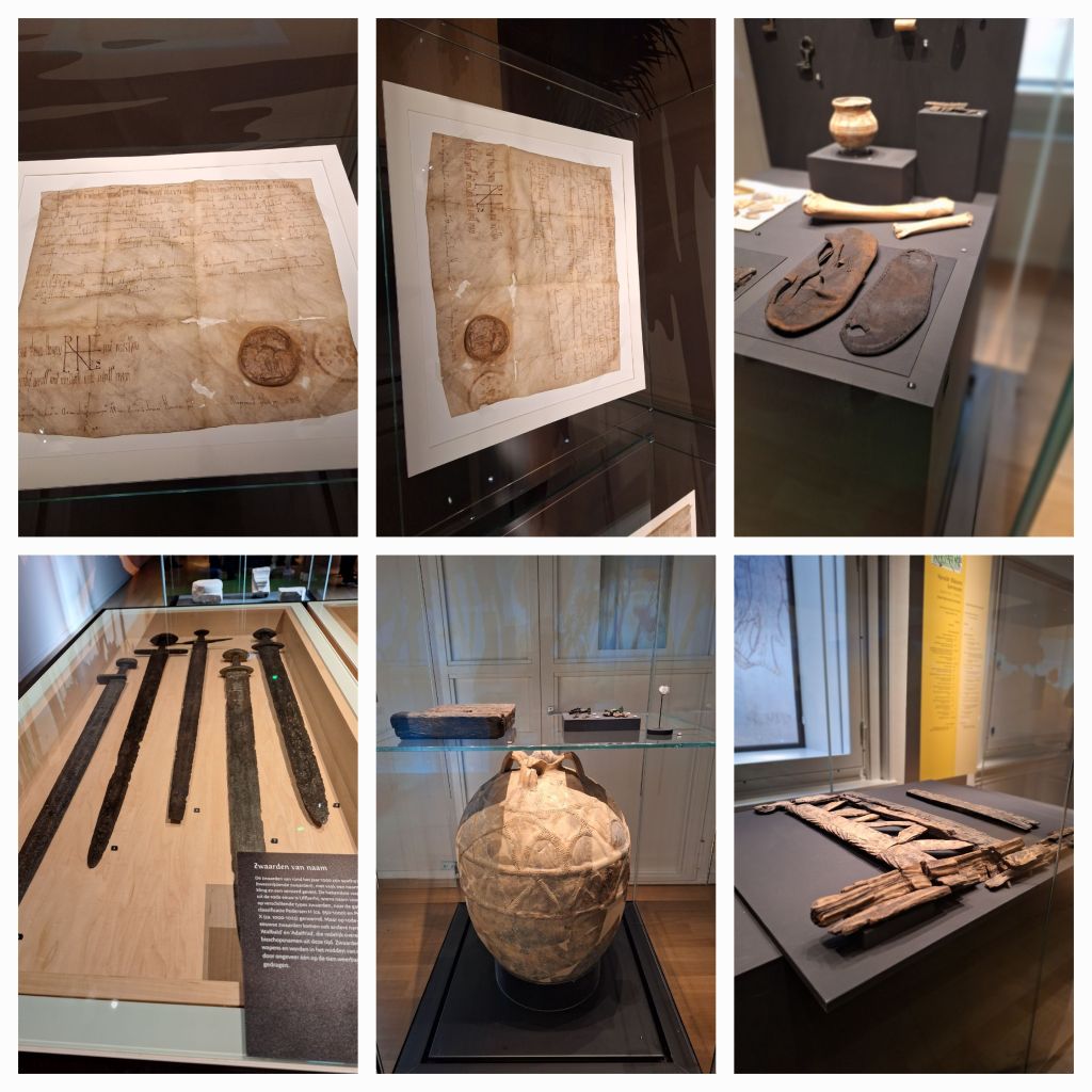 We beginnen in de dorpen en gehuchten, met de ‘gewone’ dingen. Een spa van hout, een houten ladder, hout van schepen, bewaard omdat het werd hergebruikt, als putwand of grafdeksel, een paar schoenzolen, eentje met een gat bij de grote teen, een restant van een houten bed. Maar het wordt groter, onbekende werelden komen binnen, Utrecht en Maastricht (de bisschopssteden), Rome, zelfs Byzantium. Prachtige goudschatten, muntschatten, sieraden met mooi gegraveerde stenen. De invallen van de Vikingen en Noormannen waren rond het jaar 1000 voorbij en een teken daarvan is de tot reliekhouder omgebouwde Vikingdrinkhoorn.