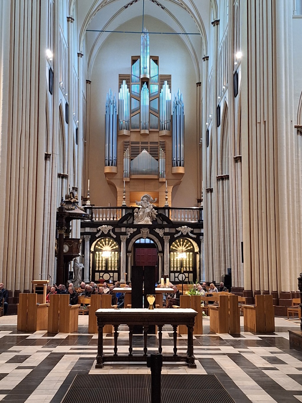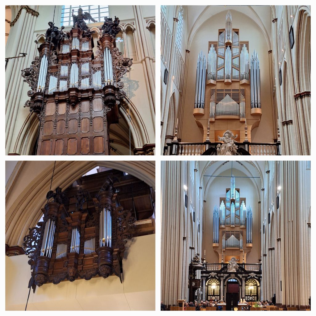 Wij worden door de organist meegenomen naar het koor, waar het rustiger is. Deze kerk beschikt over een complex orgel. Boven onze hoofden staan aan weerszijden delen van het orgel dat Klais voor de wereldtentoonstelling van 1935 bouwde. Het werd gekoppeld aan het orgel dat in 1913 in de kas uit 1653 was gebouwd. We mogen in het koor blijven zitten tijdens het concert met o.a. de altijd feestelijk klinkende muziek van Handel.