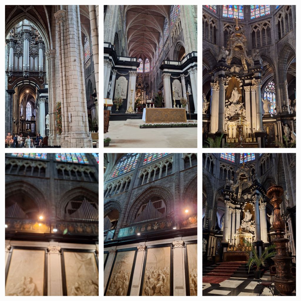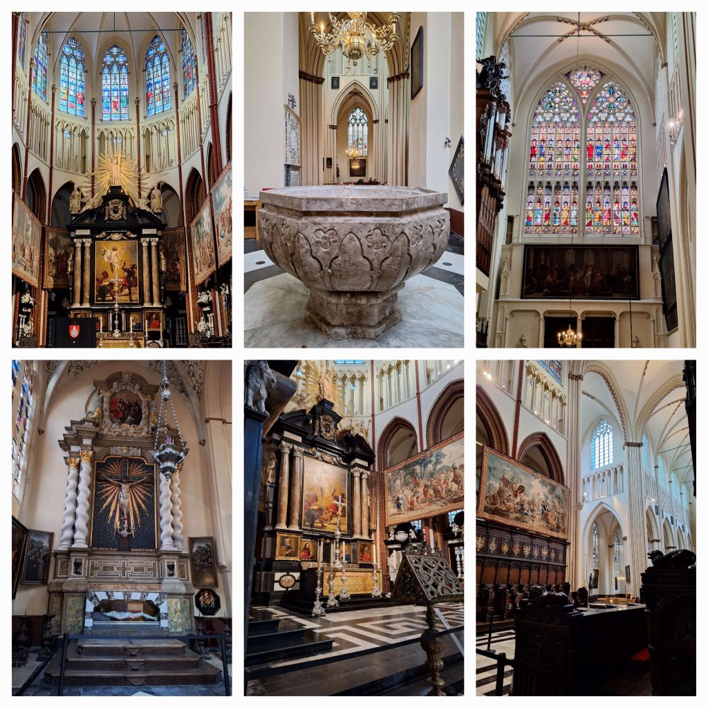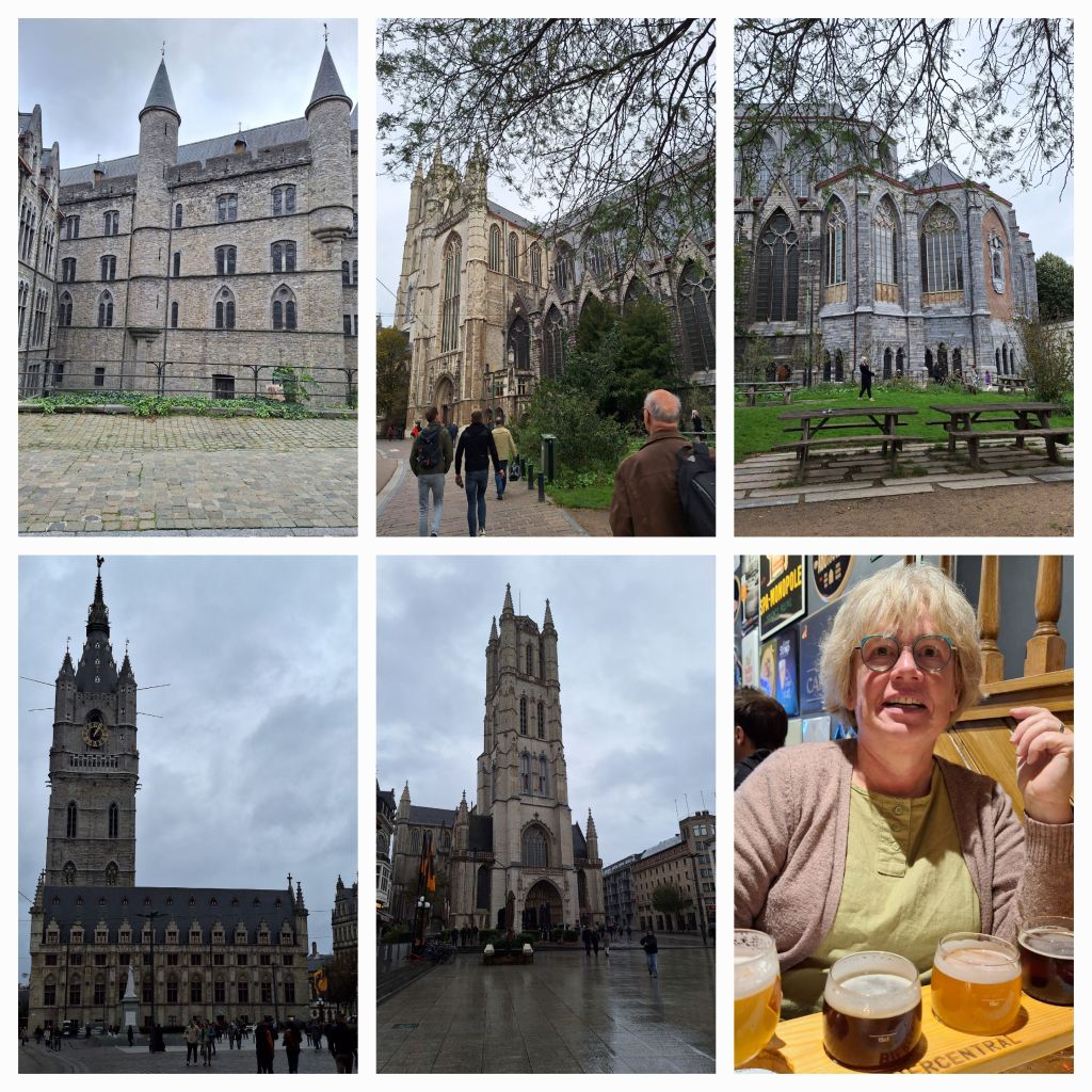 Gent is onze volgende stop. Net als bij het Nederlandse Gendt komt de naam van het Keltische Ganda, monding. Hier gaan we naar de Sint Baafskathedraal, de kerk waar het uiterst belangwekkende altaarstuk van de gebroeders Van Eyck staat: de Aanbidding van het Lam Gods, voltooid in 1432. Er staat een rij voor de ruimte waar het tegenwoordig staat.