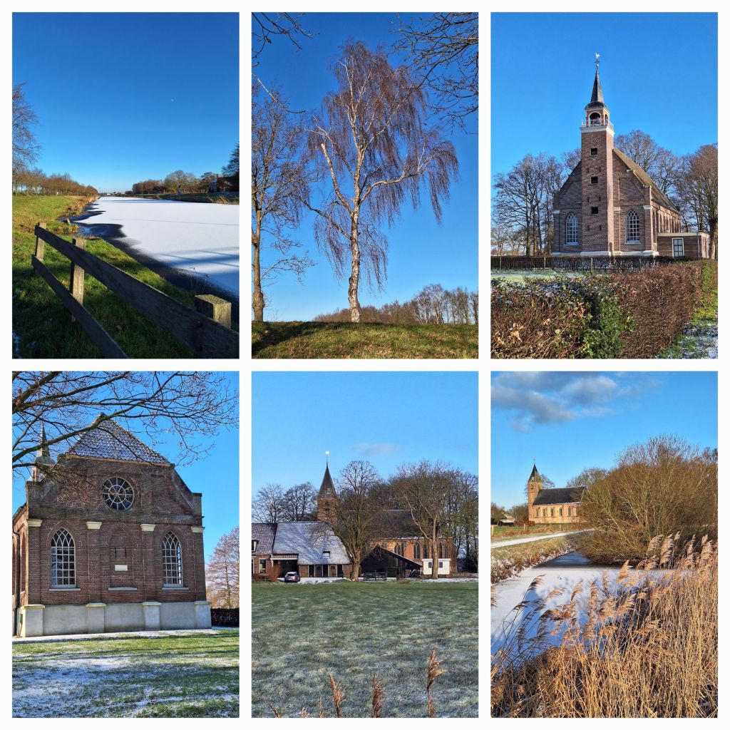Ik loop over besneeuwde wegen en paden, de zon schittert, de sneeuw is blinkend wit, de lucht hoog en hemelsblauw. Aan het spiegelende water staan prachtige boerderijen. En bij Ruinerwold zie ik een torenhaantje goud flitsen in de zon. Het is het kerkje van Blijdenstein, een buurtschap van Ruinerwold, een eenvoudig Gotisch kerkje uit de 15e of 16e eeuw. Dit Godshuis staat op een prachtig punt tussen twee strangen van de Wold Aa.