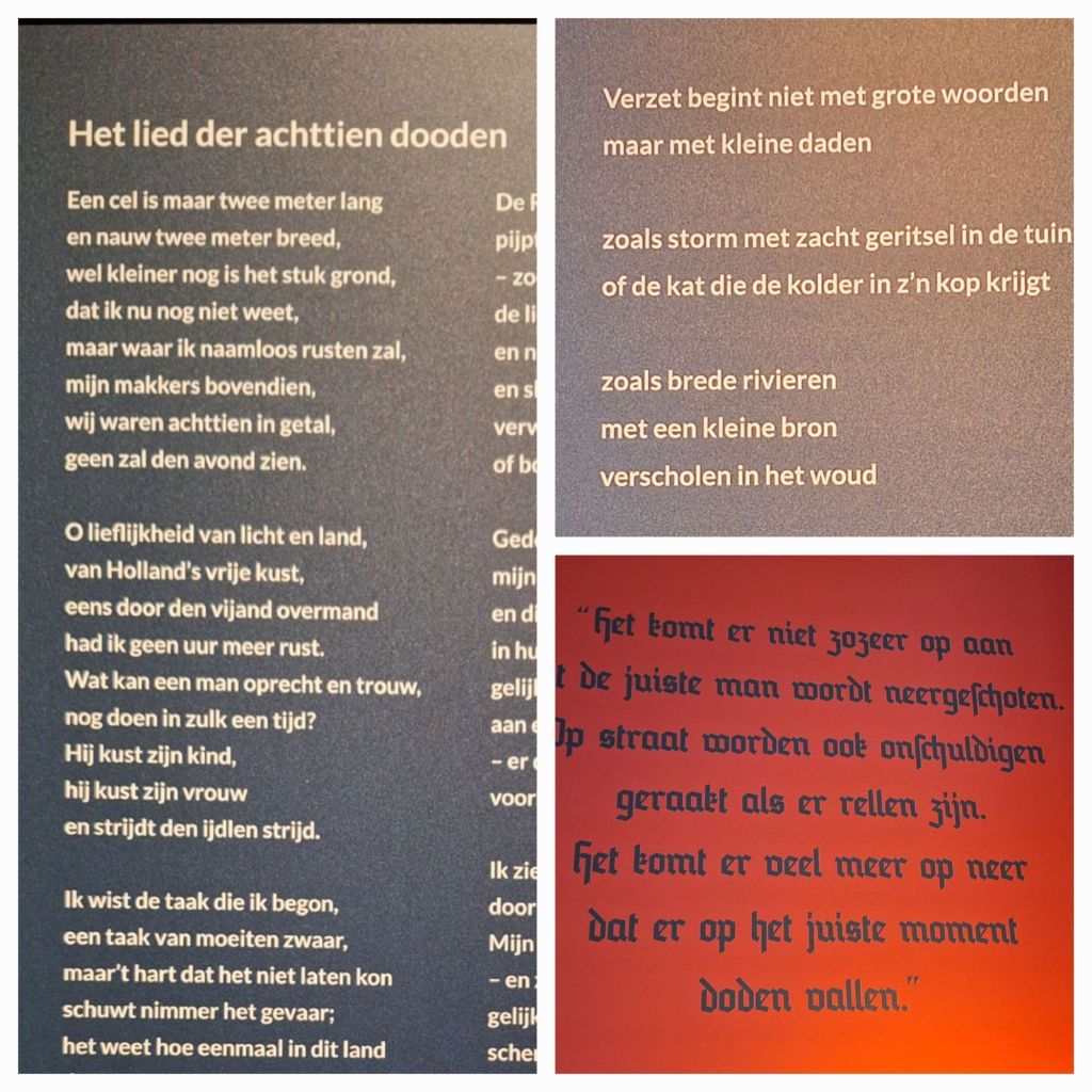 Op de muren worden vader en zoon Campert geciteerd. (Het lied van de achttien dooden en Verzet begint niet met grote woorden). En Hans Albin Rauter, de hoogste SS-er in Nederland. Het maakt niet uit wie er sterft en of deze onschuldig is of niet, als het maar op het juiste moment gebeurt. Effect, daar gaat het om.