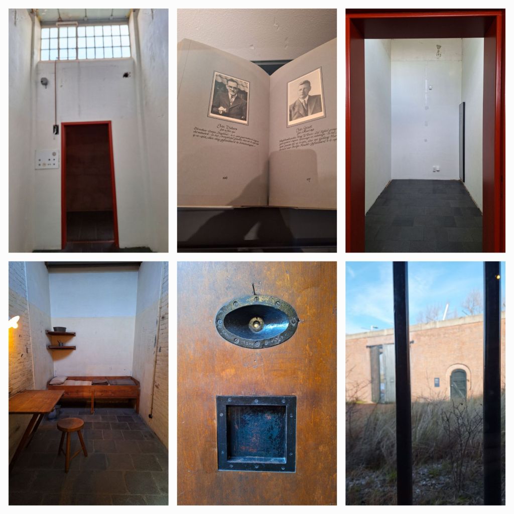 Ik zie de dodencel, nog origineel. Net als alle cellen ooit, ingericht met een houten krib, een klaptafeltje, een kruk, wat planken, een toiletemmer, 3.60 diep, 1.90 breed, 3.60 hoog, houten deur met spionnetje en etensluikje. Hoog boven de deur de enige raampjes. Als ter dood veroordeelde zat je alleen, anderen zaten wel met drie of vier in een cel.