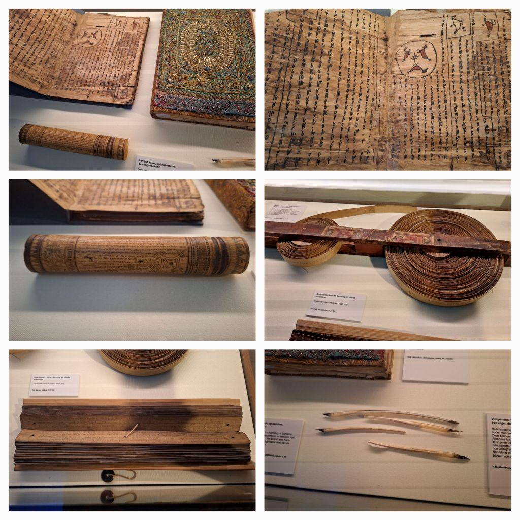 Er liggen prachtige voorbeelden van handschriften uit het tijdperk van voor de drukpers. Minutieuze tekentjes op een bamboepijpje, een soort boekrol (meer een wiel), een bezwering, beschreven bladeren, veerpennen van een jaarvogel met inkt aan de punten.