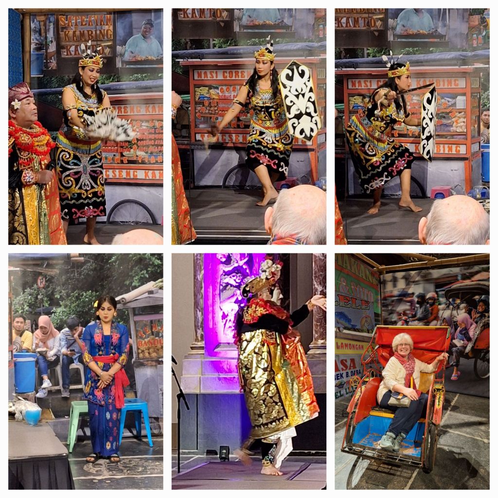 In het koor worden de danseressen voorgesteld en de dansvormen toegelicht. En wij als aanwezigen mogen meedoen. Bij de dans met de schotels -oorspronkelijk een oogstdans- krijgen we plastic kommetjes aangereikt. En bij de dans van de neushoornvogel een soort waaier van veren.