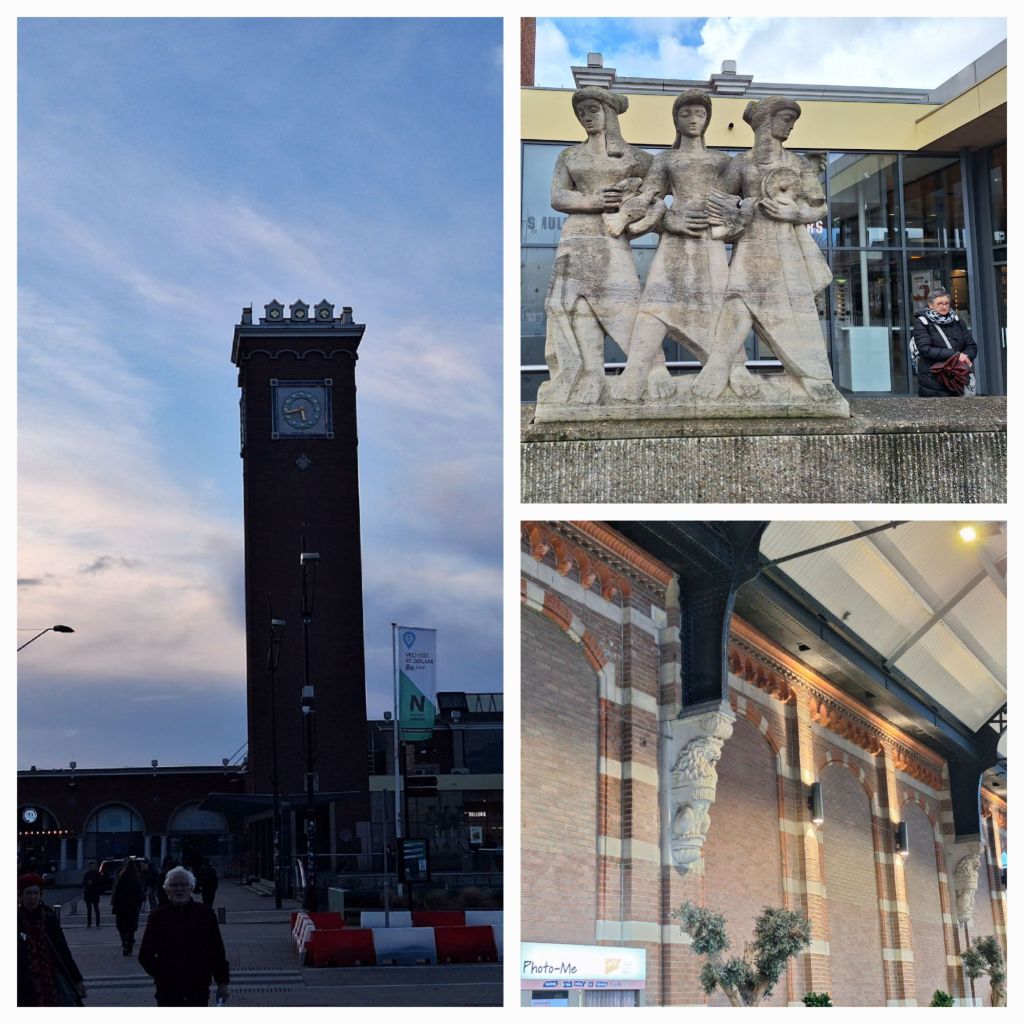 Bij het vallen van de avond loop ik naar het station. Dat was ook deels getroffen, dus is er een nieuw front gebouwd met een bijna Italiaans aandoende toren, maar op het perron zie je nog de oude muren en overkappingen.