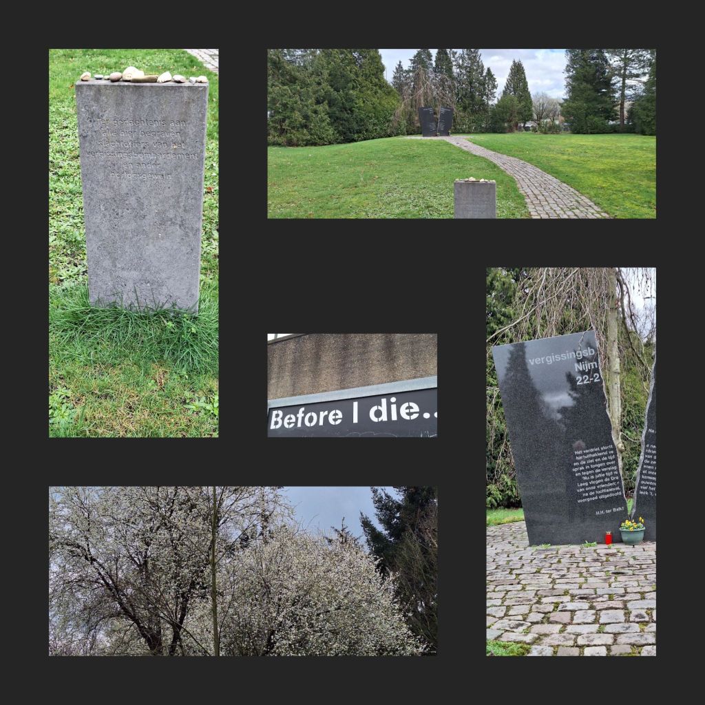 Ik zoek de metalen plaatjes (met namen van de slachtoffers) van de brandgrens en loop die helemaal langs. Wat een klein gebied, eigenlijk. En volkomen willekeurig.