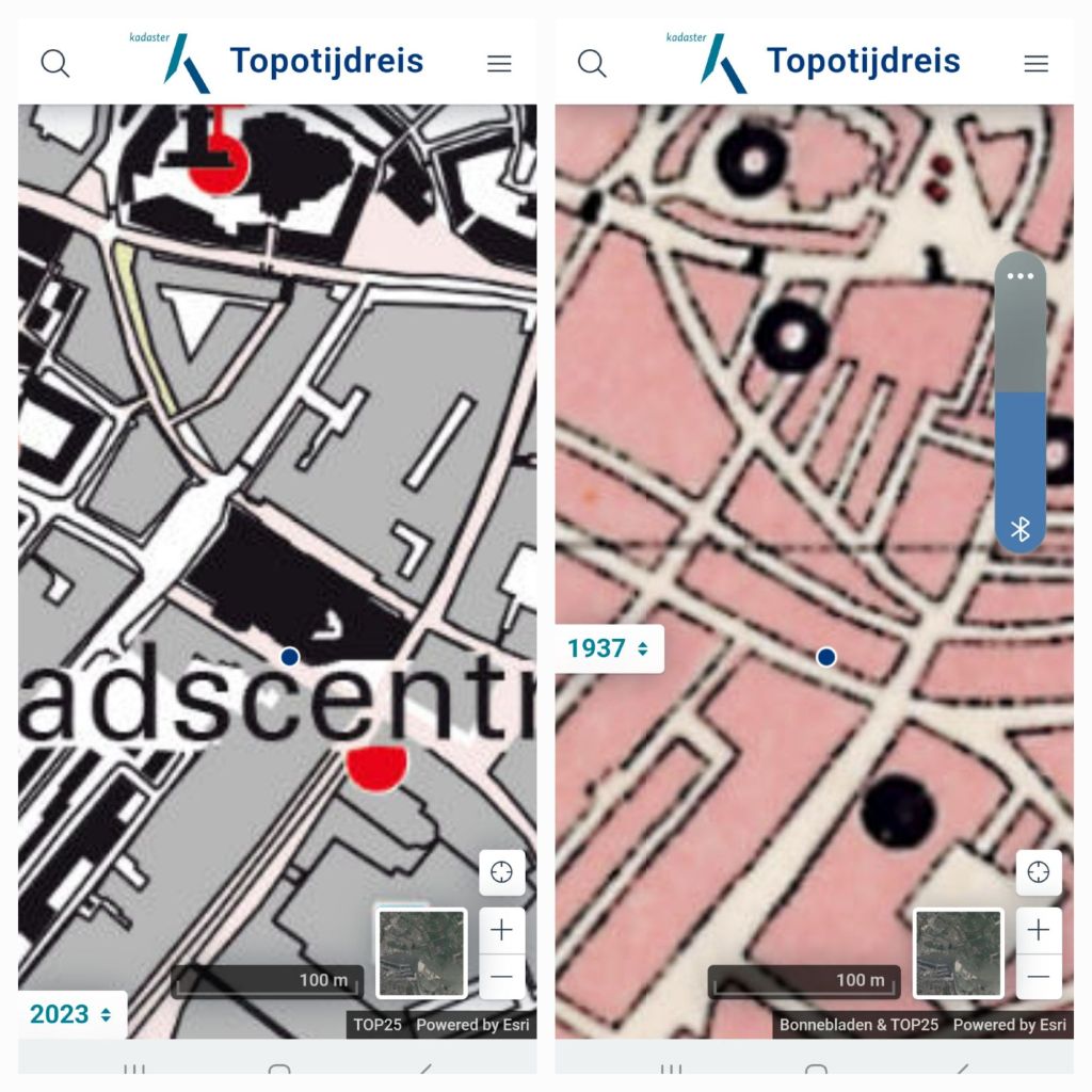 Ik loop van de begraafplaats terug naar het centrum. Op Plein 1944 is een kleine openluchttentoonstelling. Dit Plein is door het bombardement ontstaan. Op TopoTijdreis zie ik dat er drie straatjes waren vol met huizen.