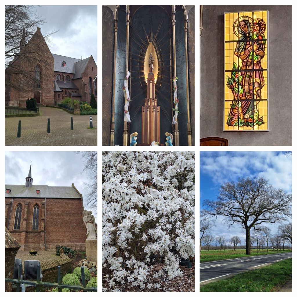 In Oostrum kom ik bij een groot kerkgebouw (de Onze-Lieve-Vrouw Geboortekerk) dat samengesteld is uit de oude eenbeukige kapel uit 1400 en een nieuwe kruisbasiliek uit de jaren 1930. Het koor van de oude kapel is nu een zijkapel. In die kapel wordt Maria vereerd. Een heel klein beeldje staat hoog op het altaar. Het zou rond 1350 gevonden zijn door een boer die beloofde een kapel te bouwen als zijn vlasoogst goed zou zijn. Die was goed en zo gezegd zo gedaan. Oostrum werd zo een bedevaartsoord compleet met Mariaprocessie. Vandaar de enorme kerk.