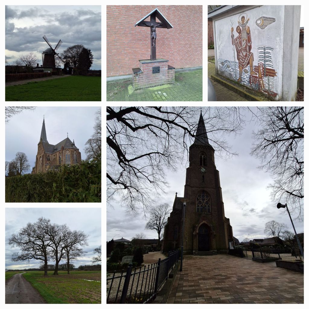 In Wemb staat aan de kant van de weg een mozaïek van de Heilige Christoforus, de Christusdrager, met het kind Jezus op zijn arm. En dan sta ik voor de 19e eeuwse Heilig Kruiskerk, helaas niet open.