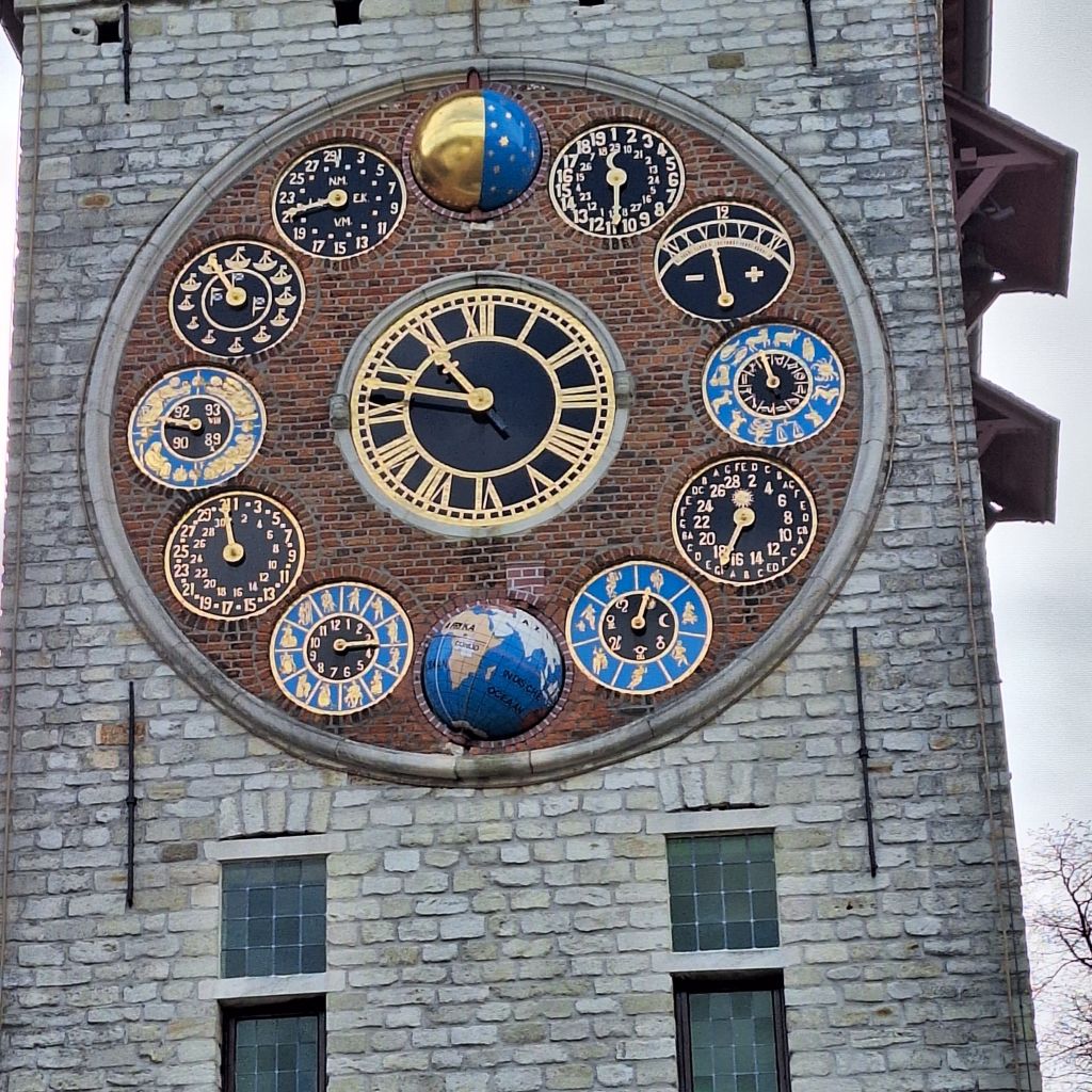 De klok is een wonder van vernuft. 57 wijzerplaten telt de klok, waarvan aan de buitenkant 13 zichtbaar. Ik zie de maanfasen, de wereldbol, de dierenring of zodiak, maar ik lees dat ook de cyclus van Meton, de epacta en de tijdsvereffening, de zonnecyclus en de zondagsletter, de week, de maanden, de datum, de seizoenen, de getijden en de schijngestalten van de maan worden aangeduid. En o ja, middenin is een grote wijzerplaat waarop ik de tijd kan aflezen. Een kunstwerk vind ik het.
