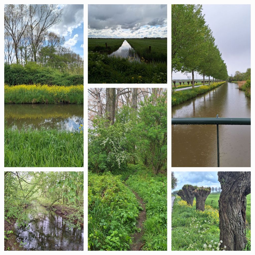 Vanmorgen vroeg hoorde ik de buren de autoruiten krabben, vanmiddag zat ik in de zon op een terrasje. Mijn dikke jas leek eerst een goede keus, toen een paar kilometer helemaal niet. Het begon te regenen en oh, wat was ik toen blij met mijn jas. En met de plu die ik vanmorgen had meegegrist. Tijdens de bui viel de wind bijna weg en het bleef daardoor geruime tijd regenen. Het was nog maar 5 graden. Maar toen ging de zon weer schijnen en het werd schitterend weer.