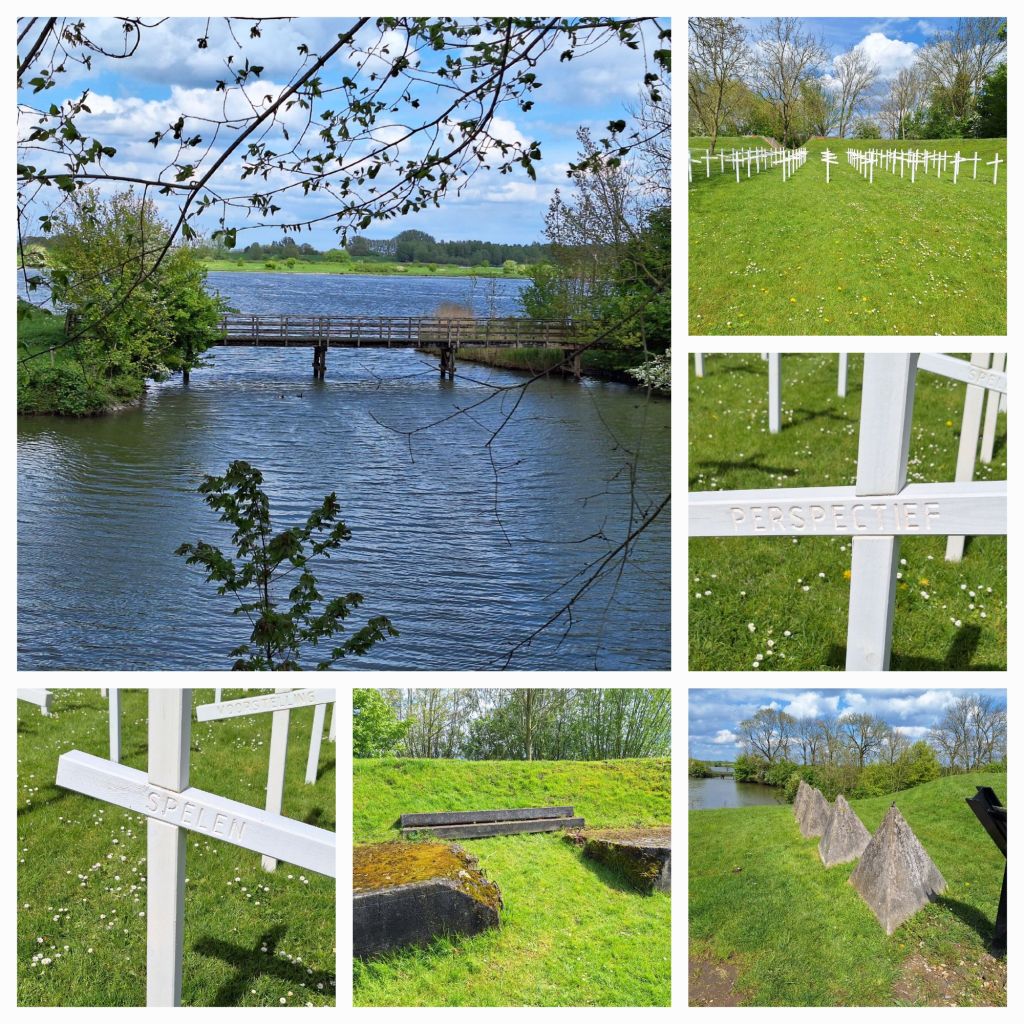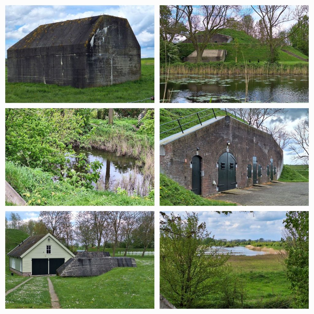 Links eerst twee betonnen groepsschuilplaatsen (in de volksmond ook wel kazematten genoemd) en dan klim ik de dijk op. Ik wandel door en over het fort, officieel Werk aan het Spoel.