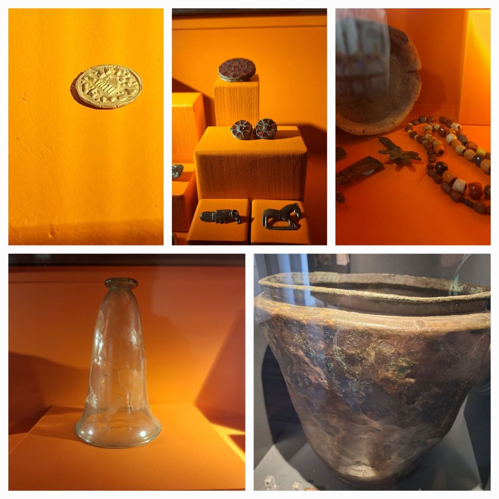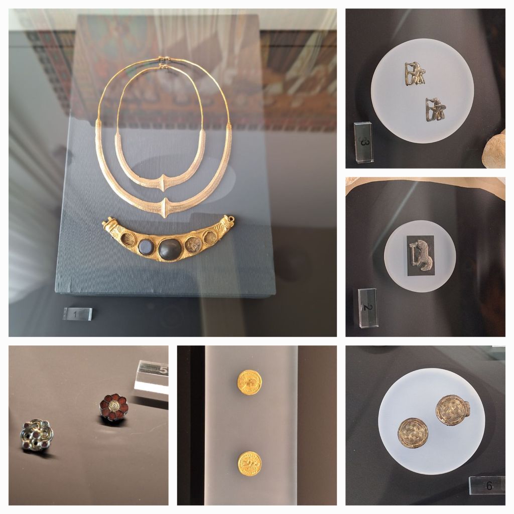 Gouden sieraden, kettingen met halfedelstenen, barnsteen en glaskralen, bergkristallen hangers, ringen, oorhangers, gouden munten, zelfs glaswerk.