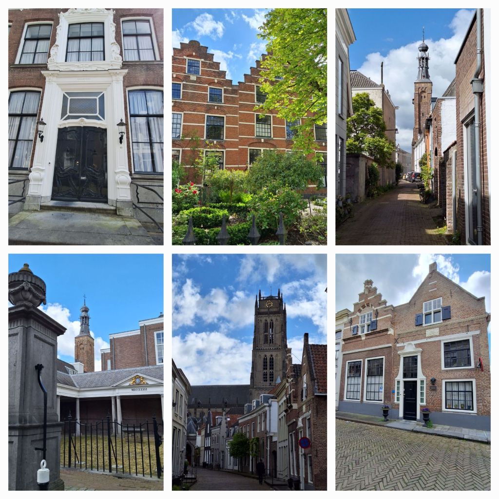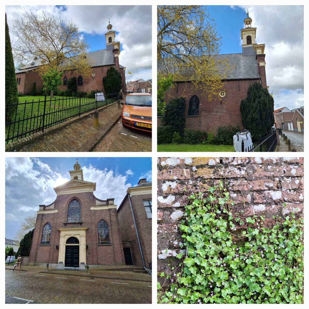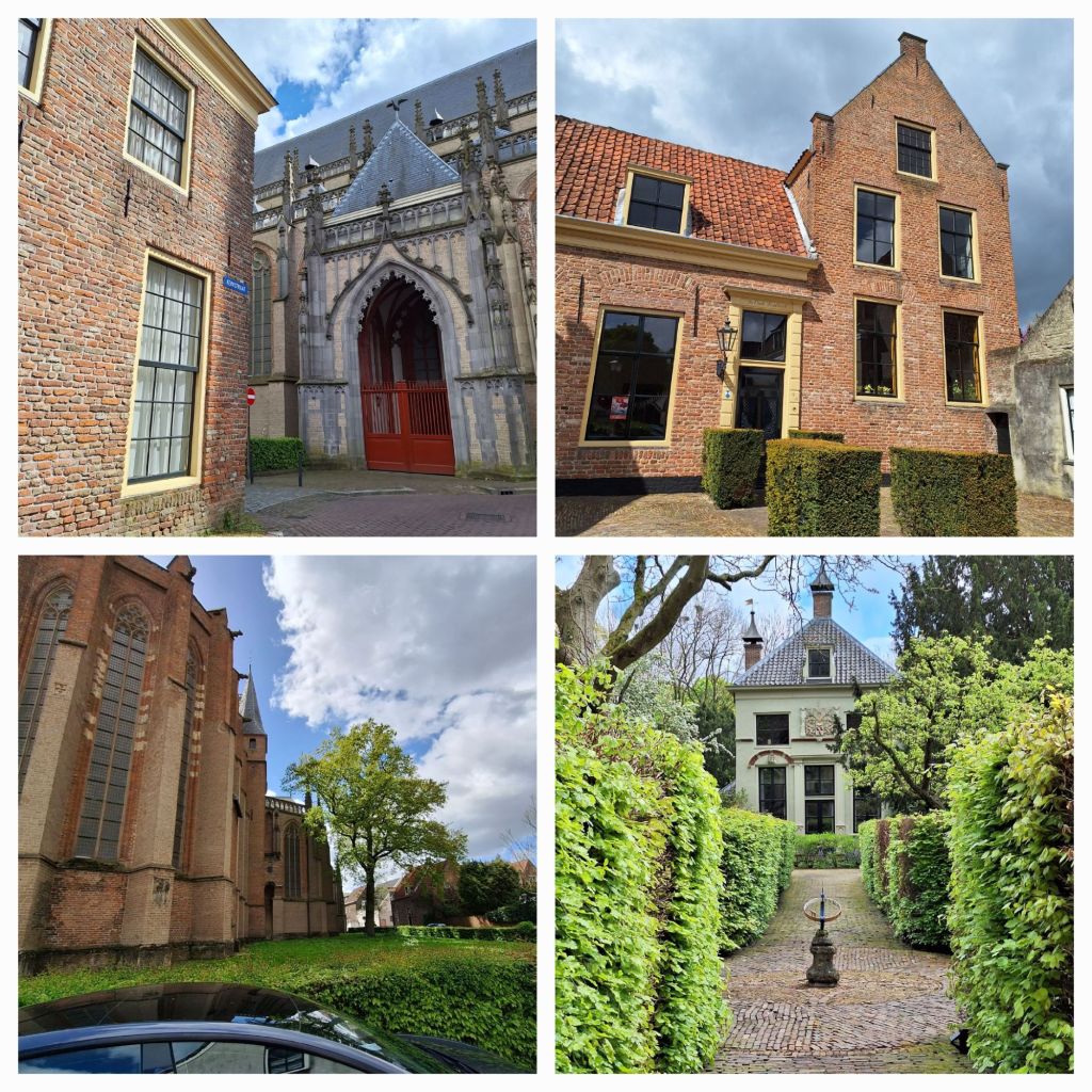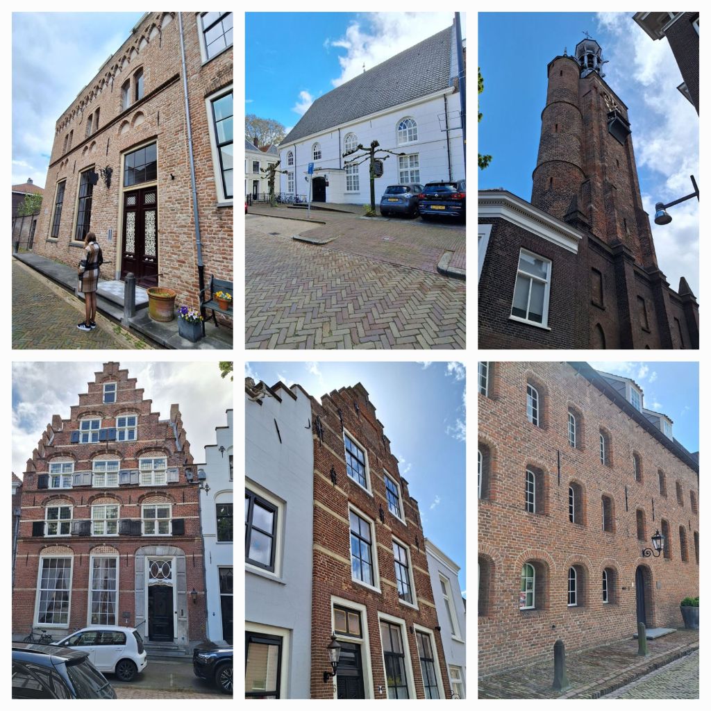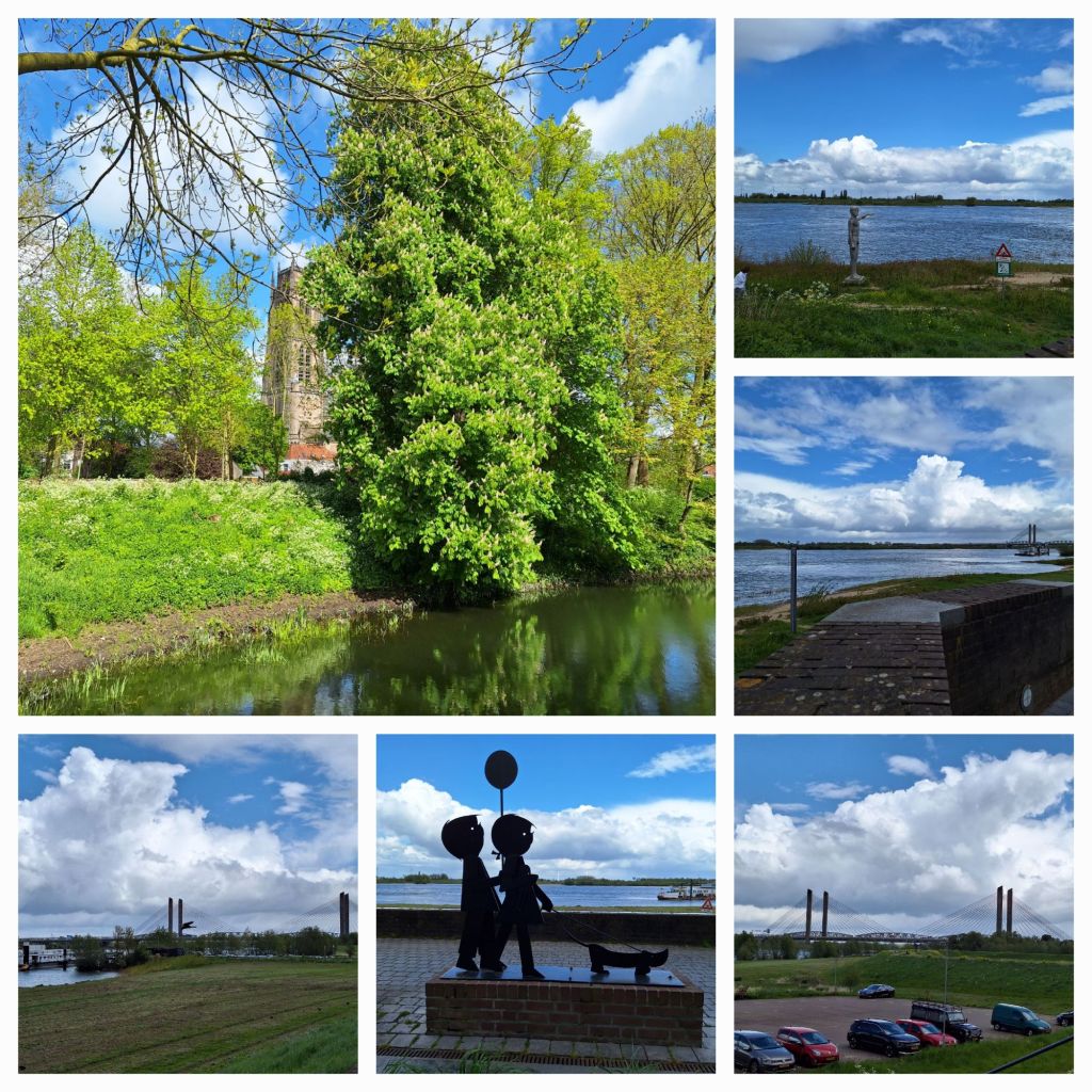Zaltbommel, daar maken we vanmiddag een stadswandeling. Het is vandaag wisselvallig weer, zo nu en dan valt er een buitje maar de wolkenluchten zijn prachtig. Op de Waal varen de schepen voorbij, het verkeer raast over de Martinus Nijhofbrug, erachter van tijd tot tijd geel-wit-blauwe treinen over de spoorbrug.