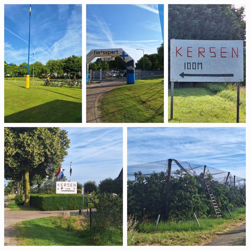 Vanmorgen om 8 uur stond ik bij de start van de Kersentocht die vanuit Tiel een grote ronde door de Betuwe zou gaan maken. Ik kreeg een zakje mee met van alles: energiegel, noodnummer, consumptiemunt en een bonnetje voor een bakje kersen bij de finish.