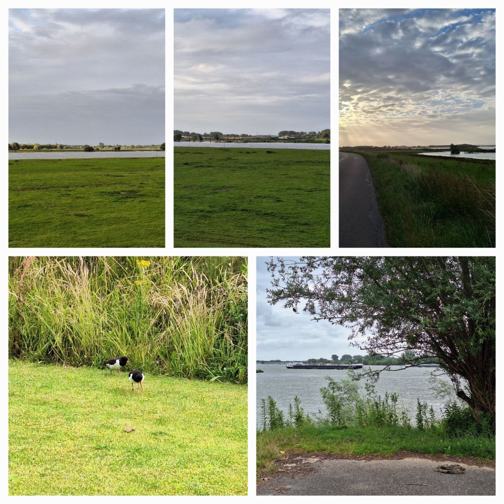 Bij Hotel Lent is het tijd voor pauze. 43 km op de teller en dan smaakt een uitgebreid tweede ontbijt prima. Als ik ga zitten zie ik door het raam twee scholeksters druk foerageren in het gras. Goed voorbeeld, zullen we maar zeggen.