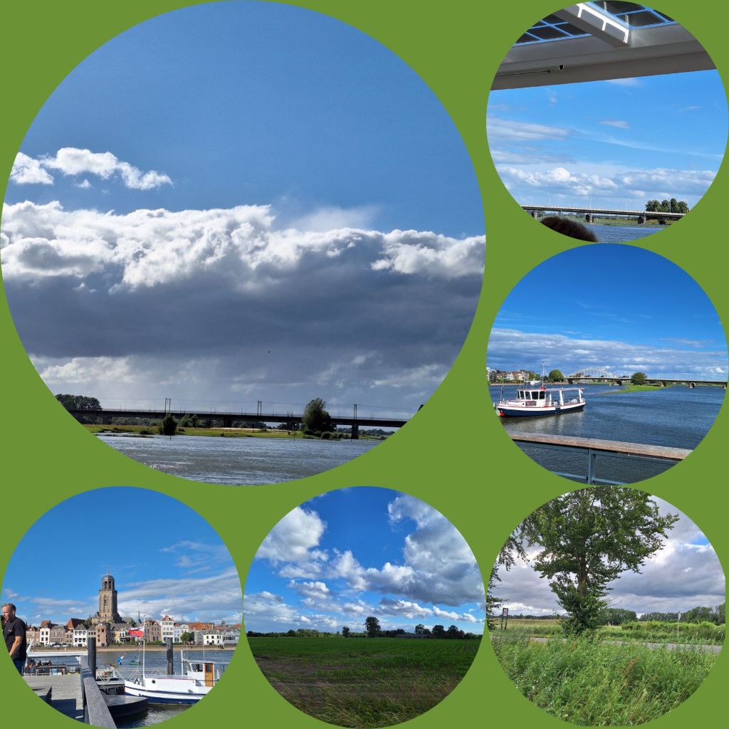 Als ik uiteindelijk vertrek vanuit Deventer, met de pont, maak ik nog wat foto’s. Het is zonnig, het waait nog steeds hard en Deventer is schitterend vanaf het water en de overkant.