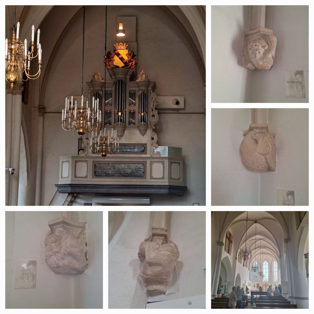 Ik loop om en door de kerk en mijn oog valt op bijzonder beeldhouwwerk. Tussen pilaren en de gewelfbogen zitten kleine consoles die de zeven deugden, de zeven doodzondes en de vier evangelisten voorstellen.