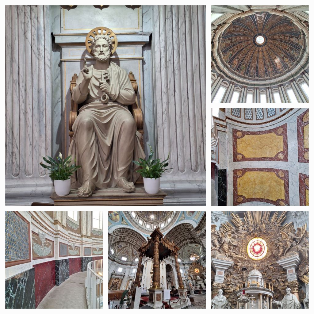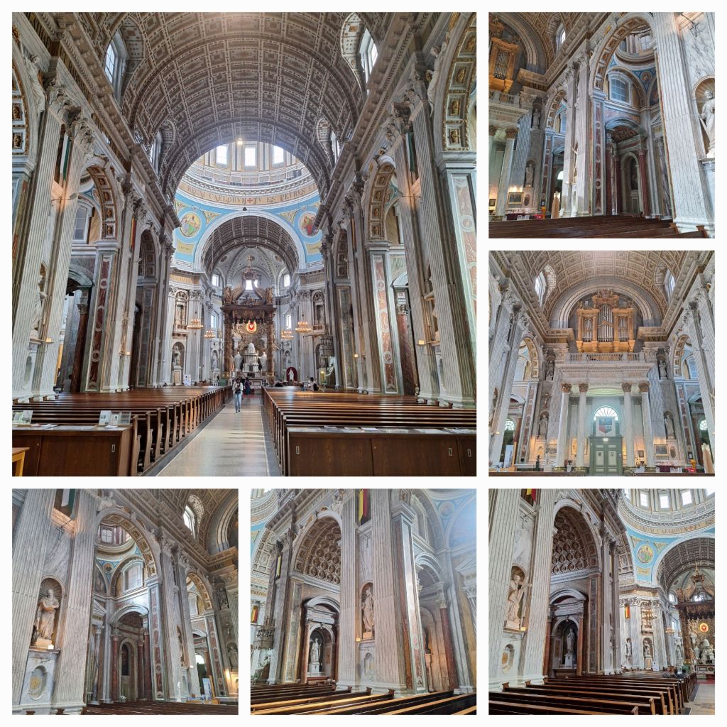 Toch maakt dat de kerk niet minder indrukwekkend. Tuurlijk, de Sint Pieter is heel veel groter (220 m lang, 150 m breed, 138 m hoog), alles glimt en blinkt daar van het marmer en brons en goud en zilver.